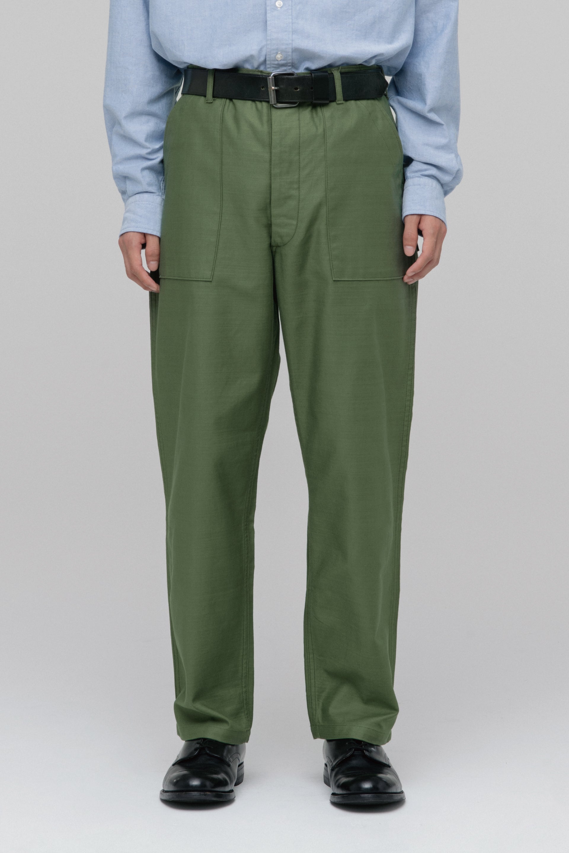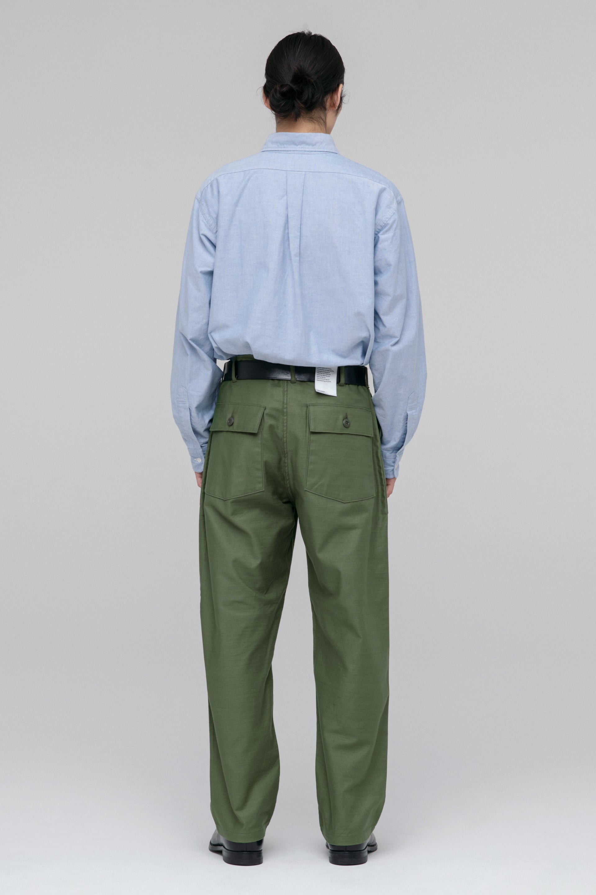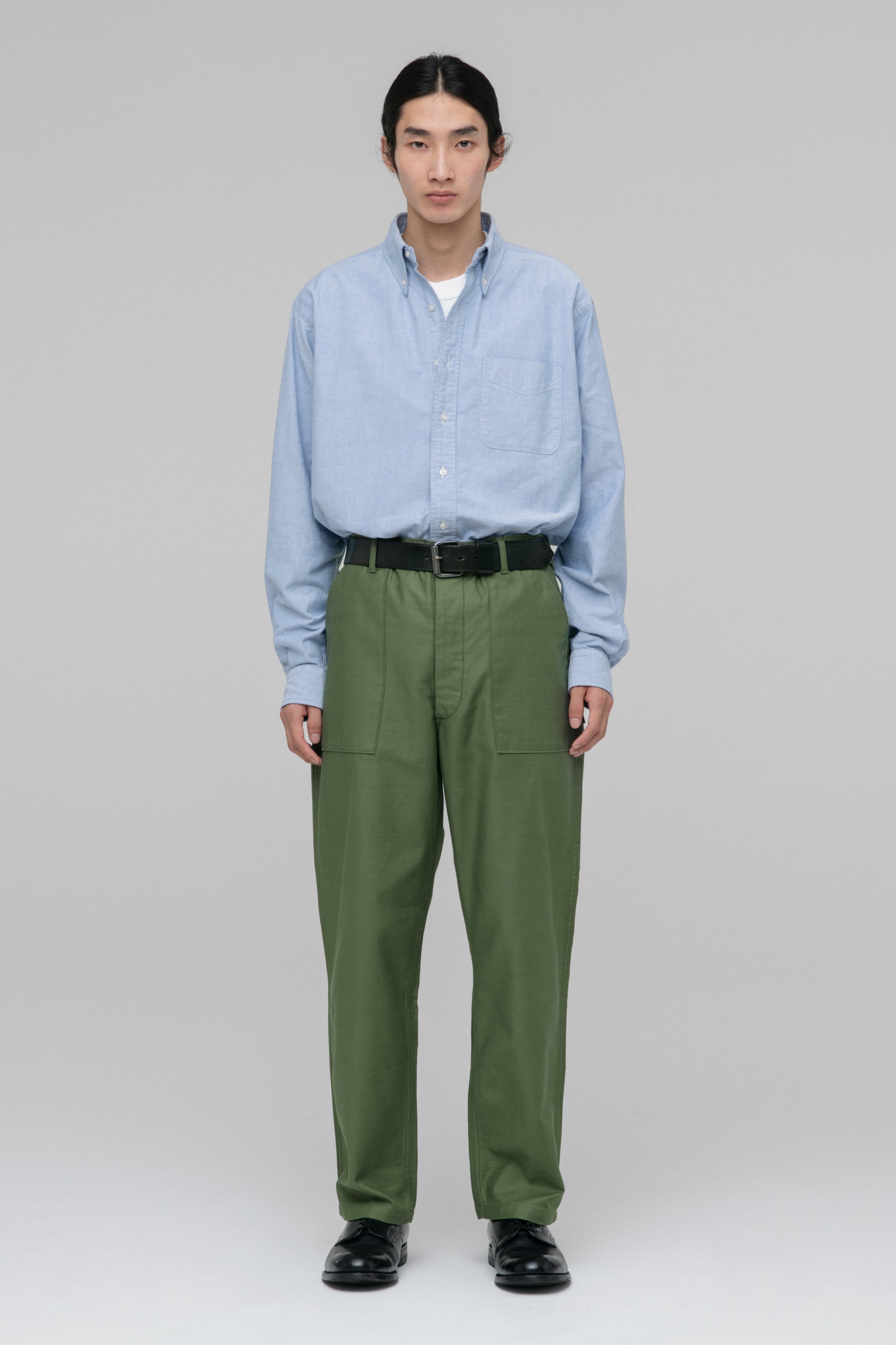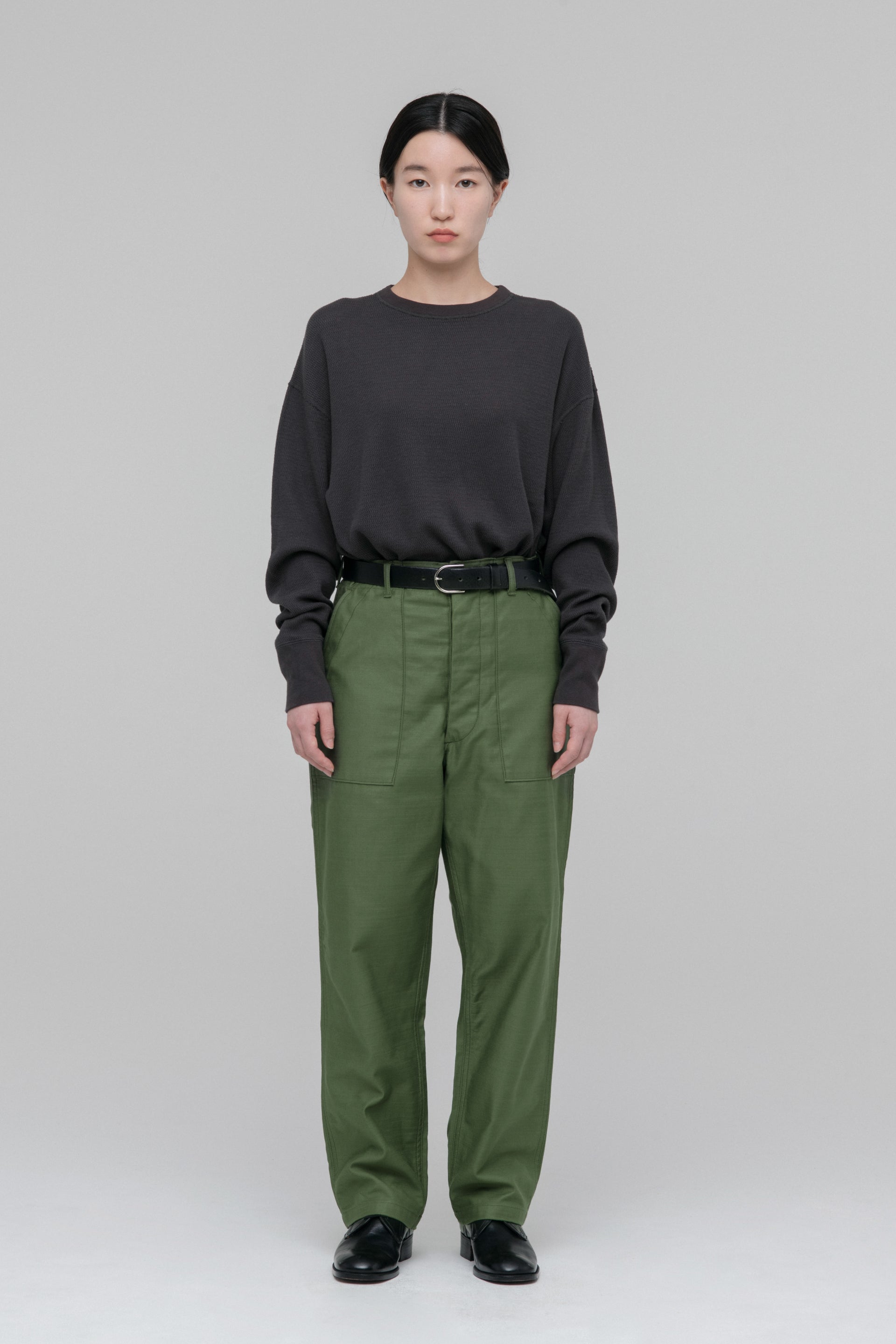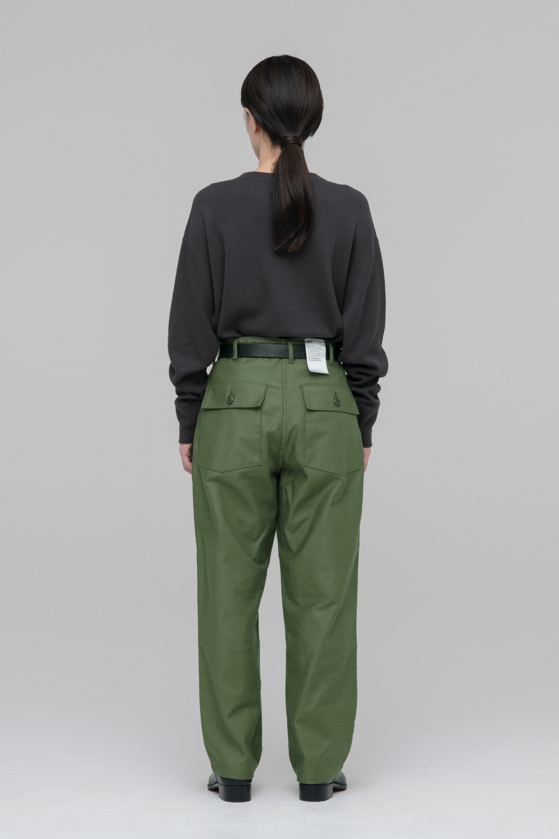 3rd model of CIOTA's signature item, the baker trousers. The fabric is a newly developed back satin. The fabric is made from an original uneven yarn, which was finally arrived at after repeated prototyping. Both the warp and weft are made of 100% suvin cotton, so the fabric is high-density but soft and smooth to the touch. The more it is washed, the more flexible and expressive it becomes. The material can also be enjoyed as it ages. The design and details, such as the wide tapered silhouette, urea buttons and single-stitched pockets, are inspired by the baker trousers used by the US military in the early 1970s.