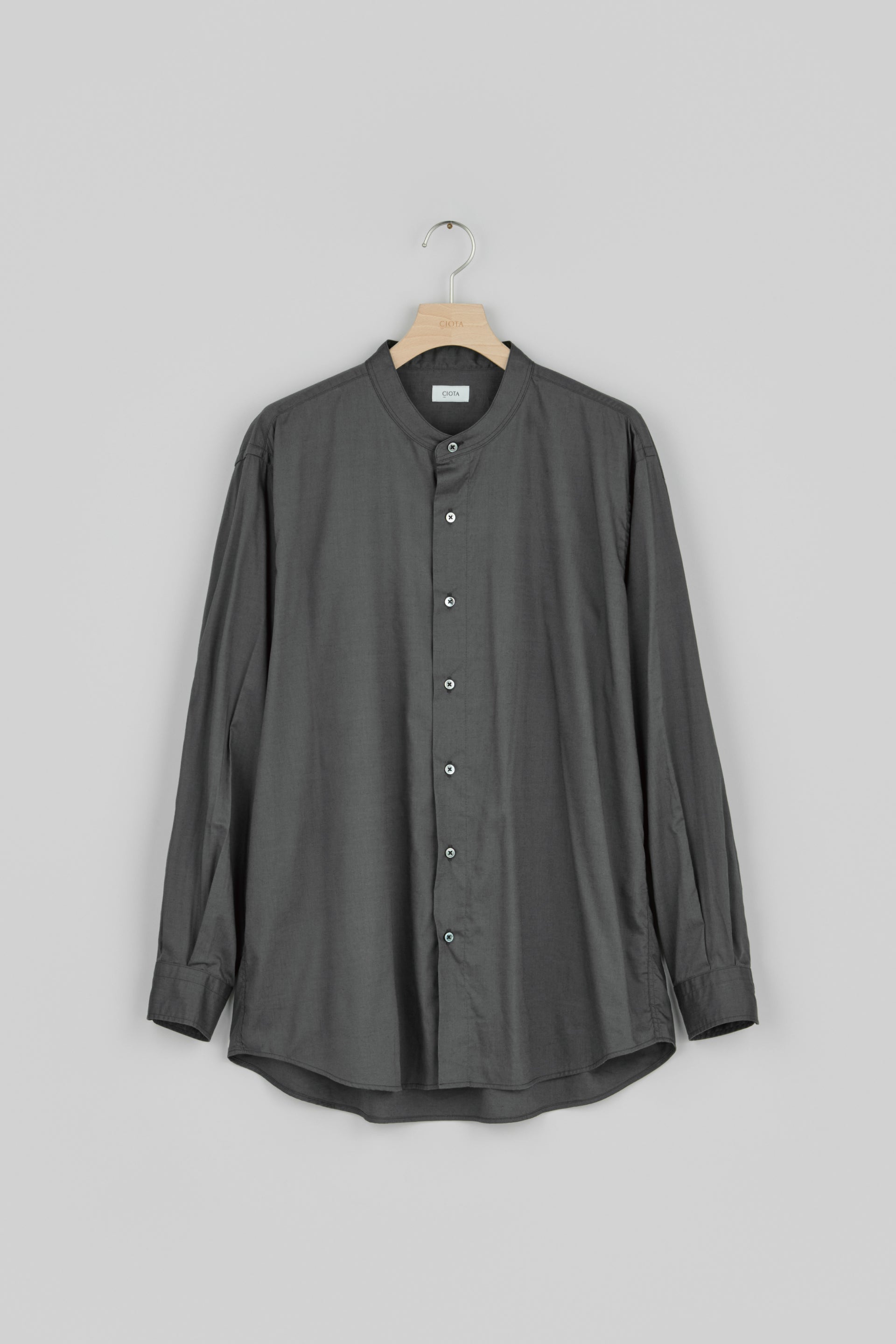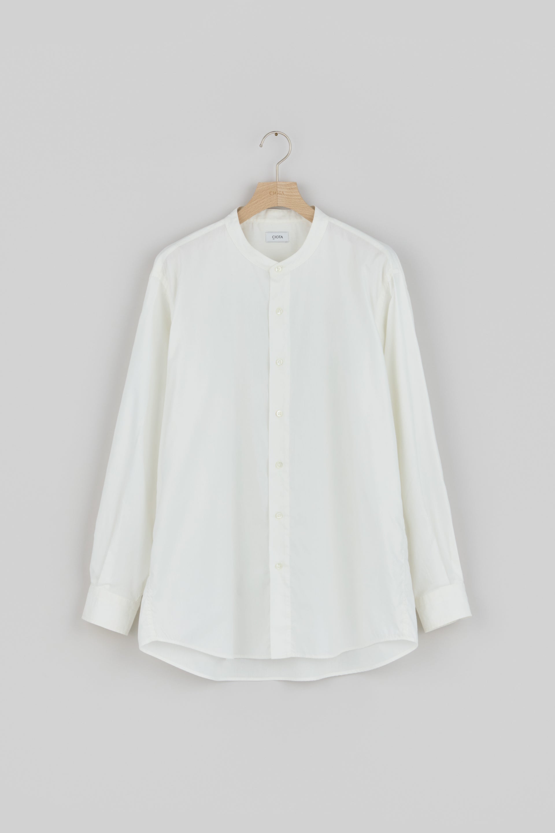 CIOTA's standard band collar shirt is made from a newly developed cotton rayon typewriter fabric. Rayon, made from wood pulp, has a silky sheen and a cool touch. It has higher moisture absorbency and better breathability than cotton, making it the perfect material for hot, sweaty seasons. This material is a high-density interwoven of rayon and suvin cotton. Enjoy its elegant sheen and smooth feel. The design motif is vintage American clothing from the 1960s. The delicacy of the fine threads and fine needlework of dress shirts coexists in perfect balance with the casualness of workwear made with Okayama's unique rolled-sew sewing machine.