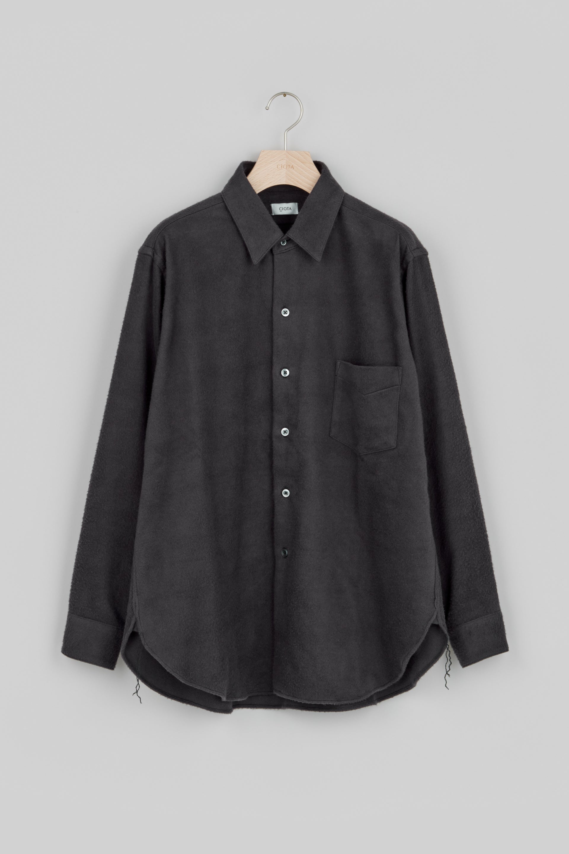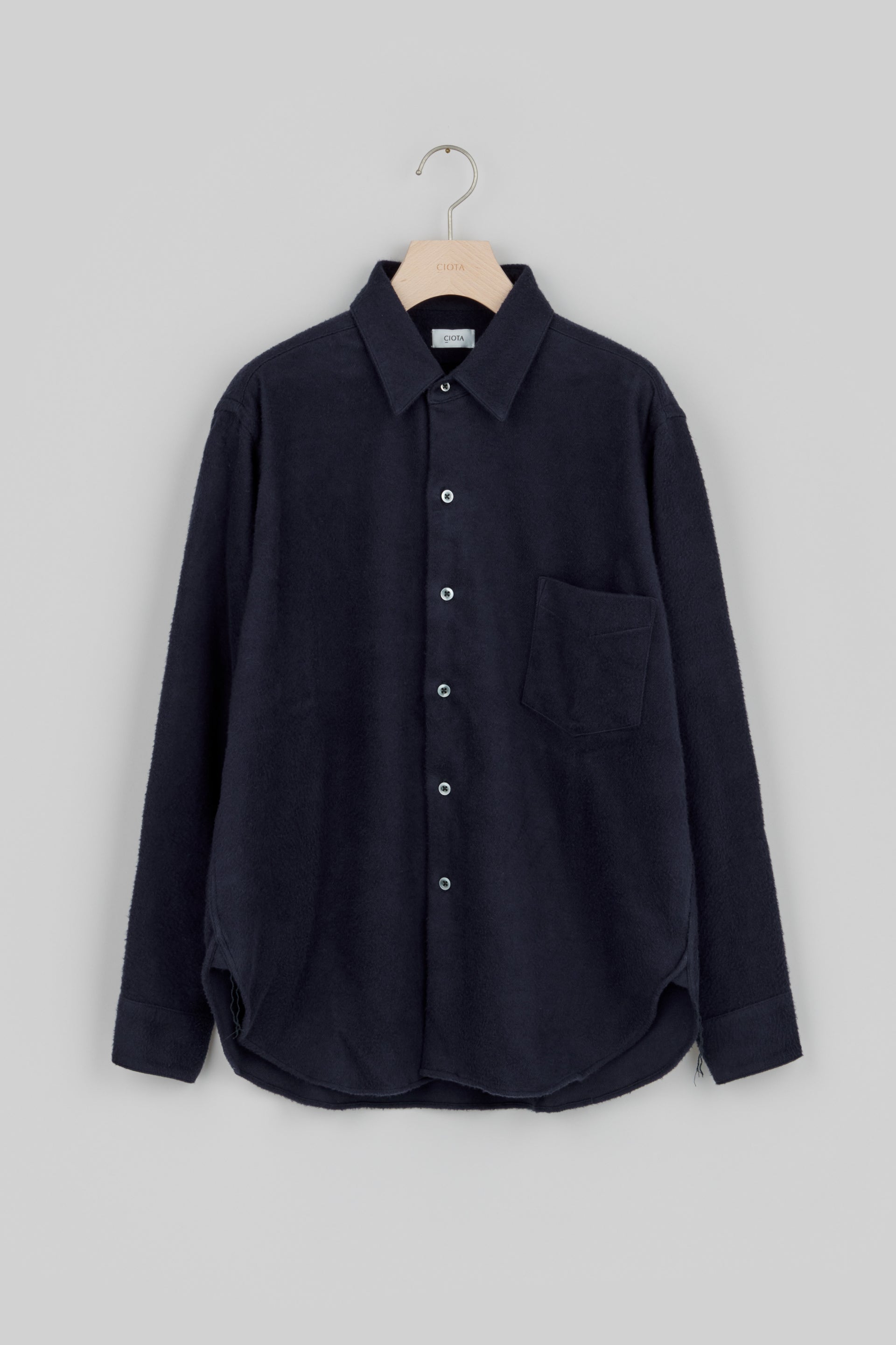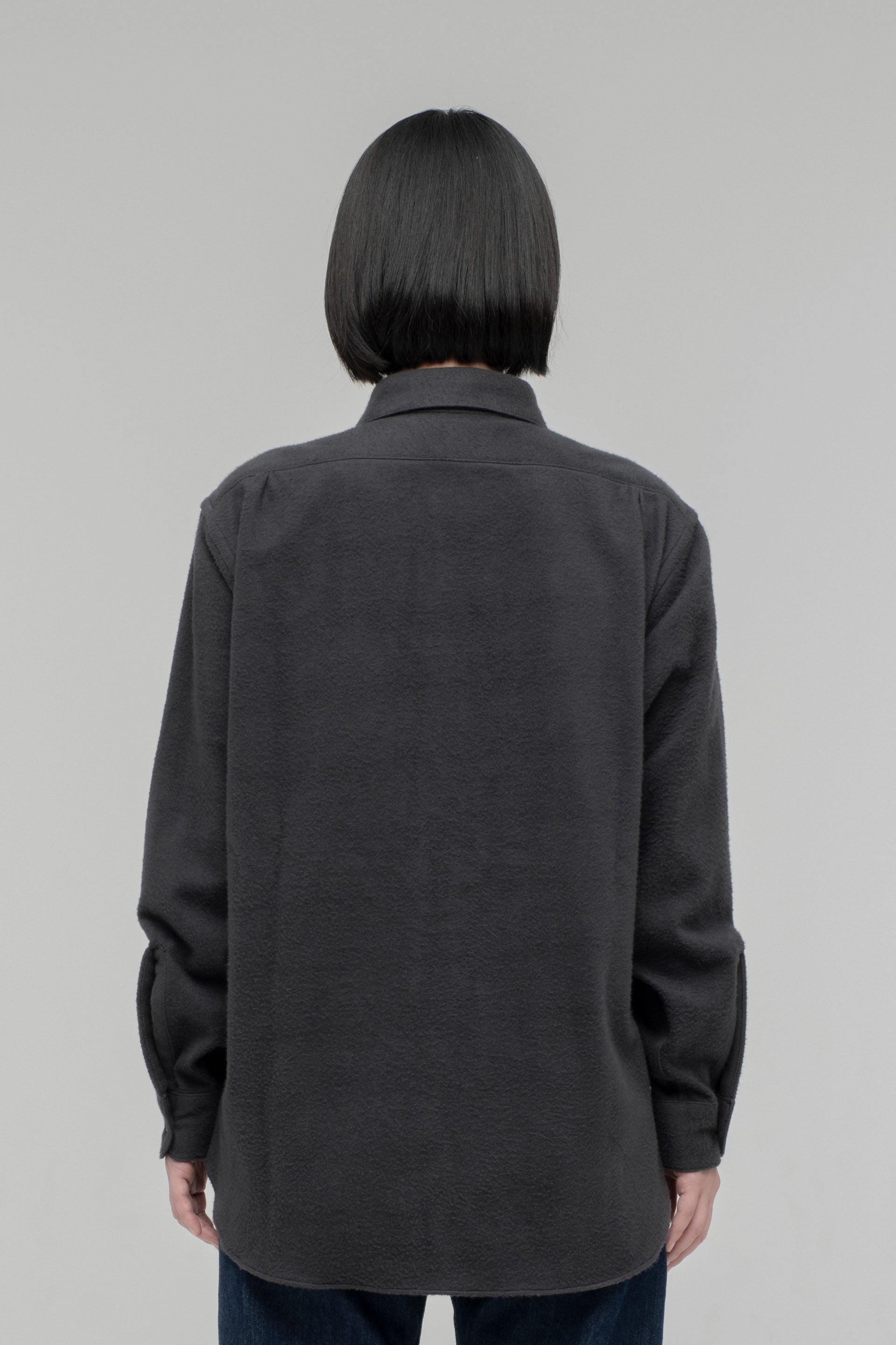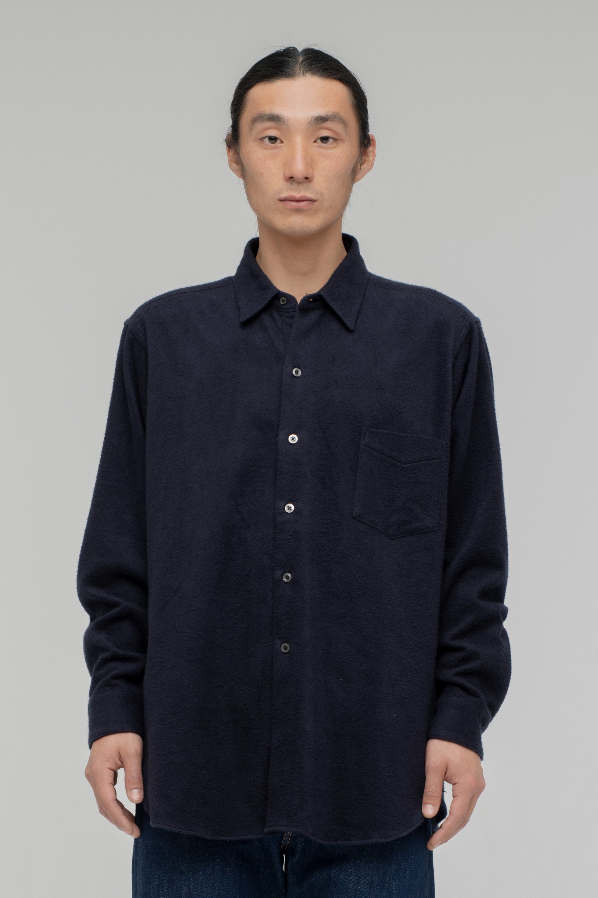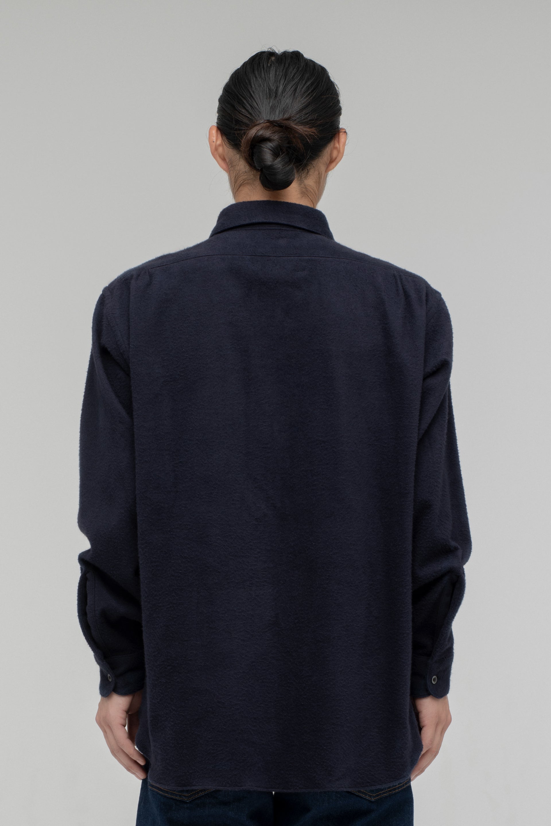A simple regular-colored shirt in 100% suvin cotton flannel, made of three fine yarns sweetly twisted and woven at a very low speed to give the flannel a supple, fluffy texture. The flannel is then raised gradually and in several separate layers using a needle cloth raising machine, giving it a shaggy raised finish. The design motif is vintage American clothing from the 1960s, with a mixture of dress and work details. The delicate sewing of dress shirts with fine threads and fine stitches and the casual look of workwear with Okayama's unique rolled-sew sewing machine coexist to create a unique look.