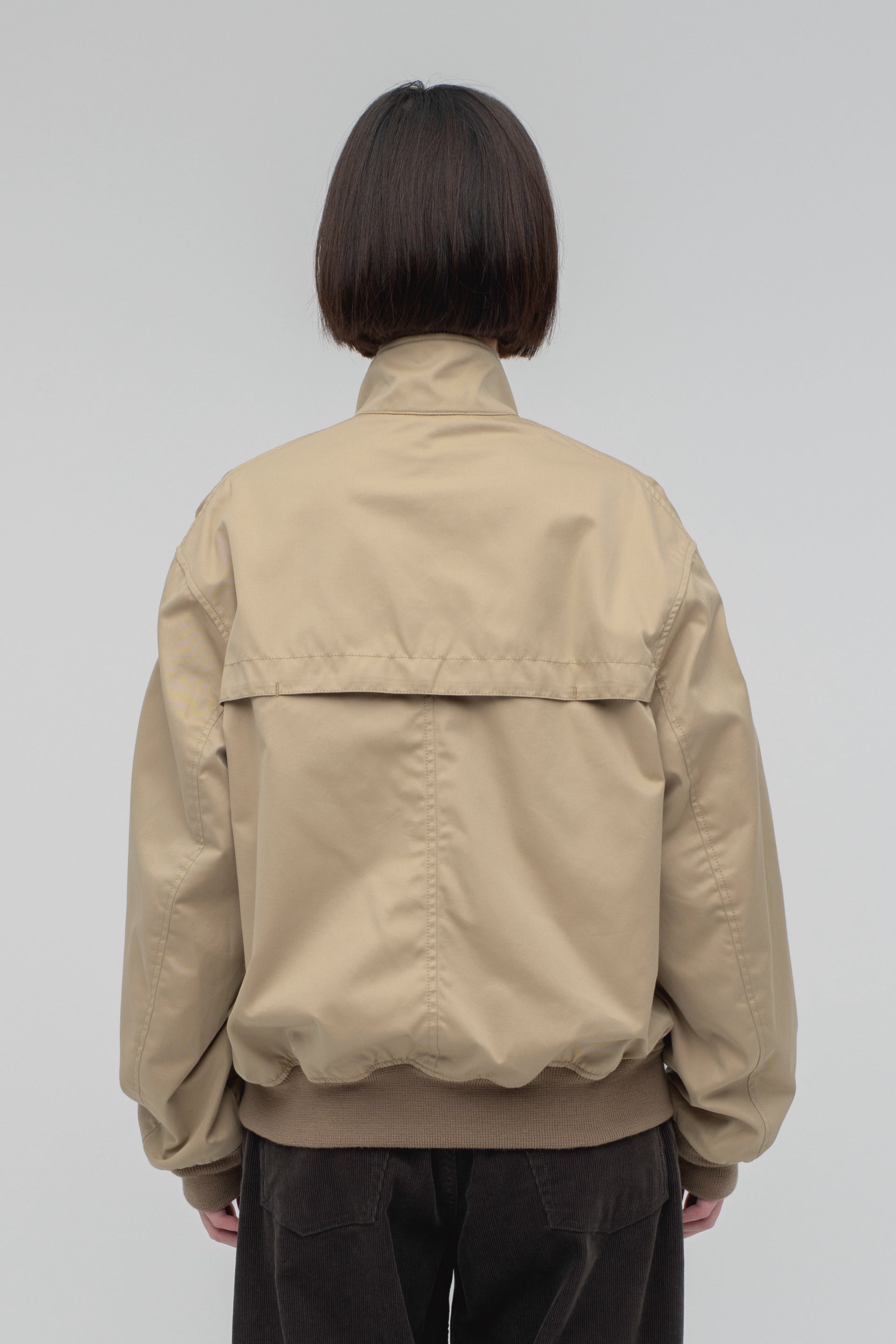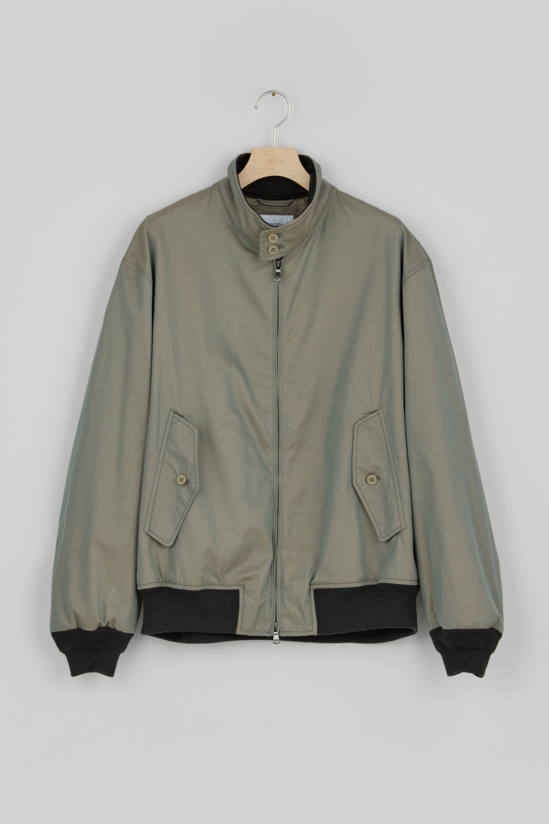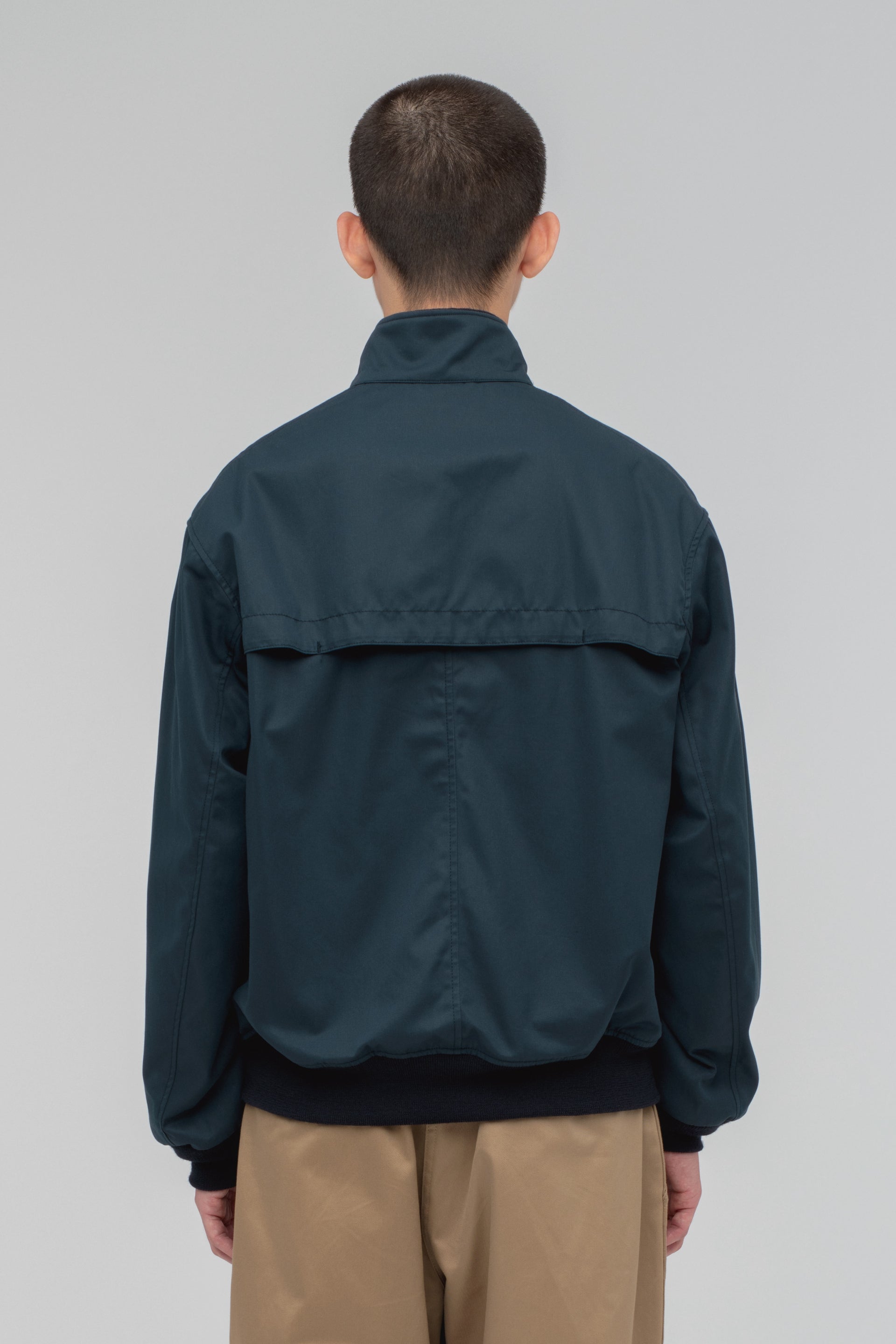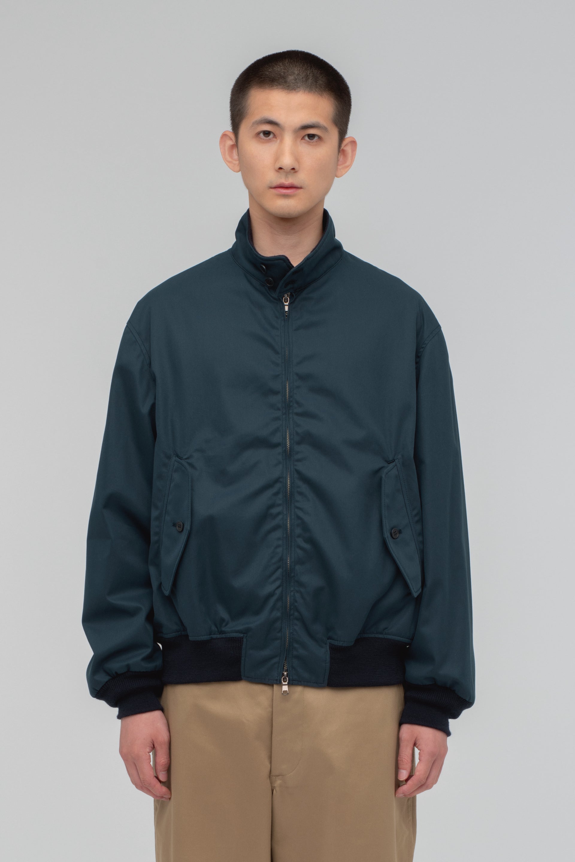 This golf jacket is made from original chambray gabardine. The gabardine is woven with high density and high thread count using 100/3 yarn, which is made by twisting three strands of rare and delicate 100/1 superfine Svin cotton to enhance strength and uniformity. It is characterized by its delicate luster and firmness. The deep colors and iridescent effect unique to yarn-dyed fabrics are also beautiful. Additionally, the gabardine's characteristic vertical drape elegantly highlights the fabric's unique properties.