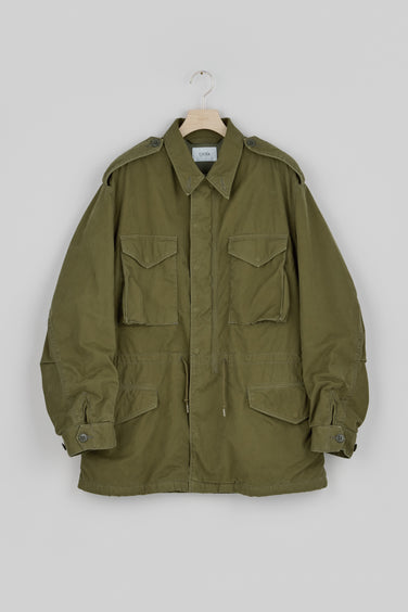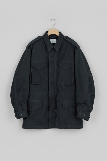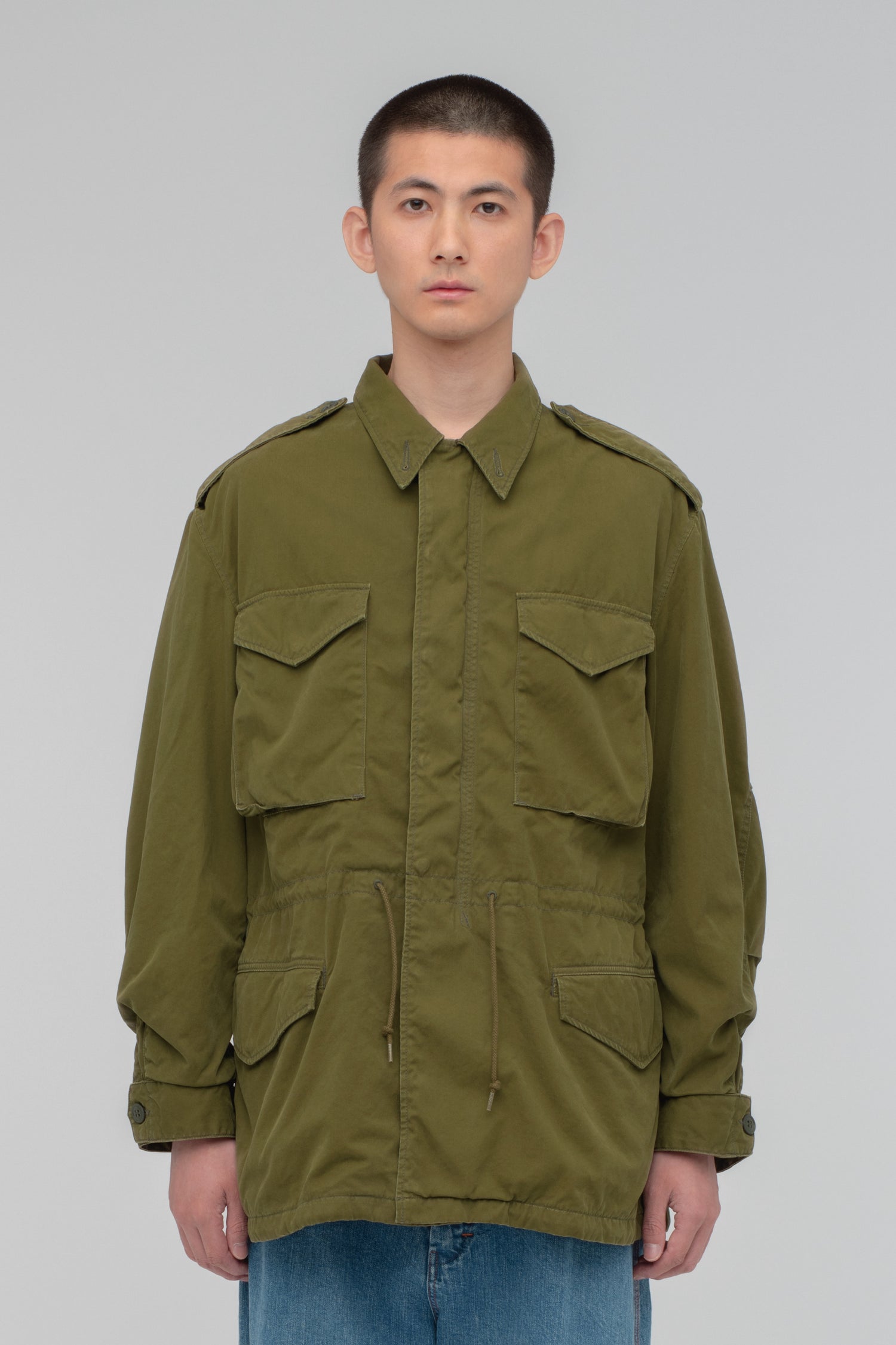 Sampled from the M-1951 Field Jacket, a classic American military outerwear item featuring large flap pockets on the chest and waist and epaulettes on the shoulders. The fabric is duck, woven with thick yarn at high density. Durability is its strong point, but this jacket also has a supple feel thanks to the use of combed cotton. Stonewashed for a rough, vintage look.