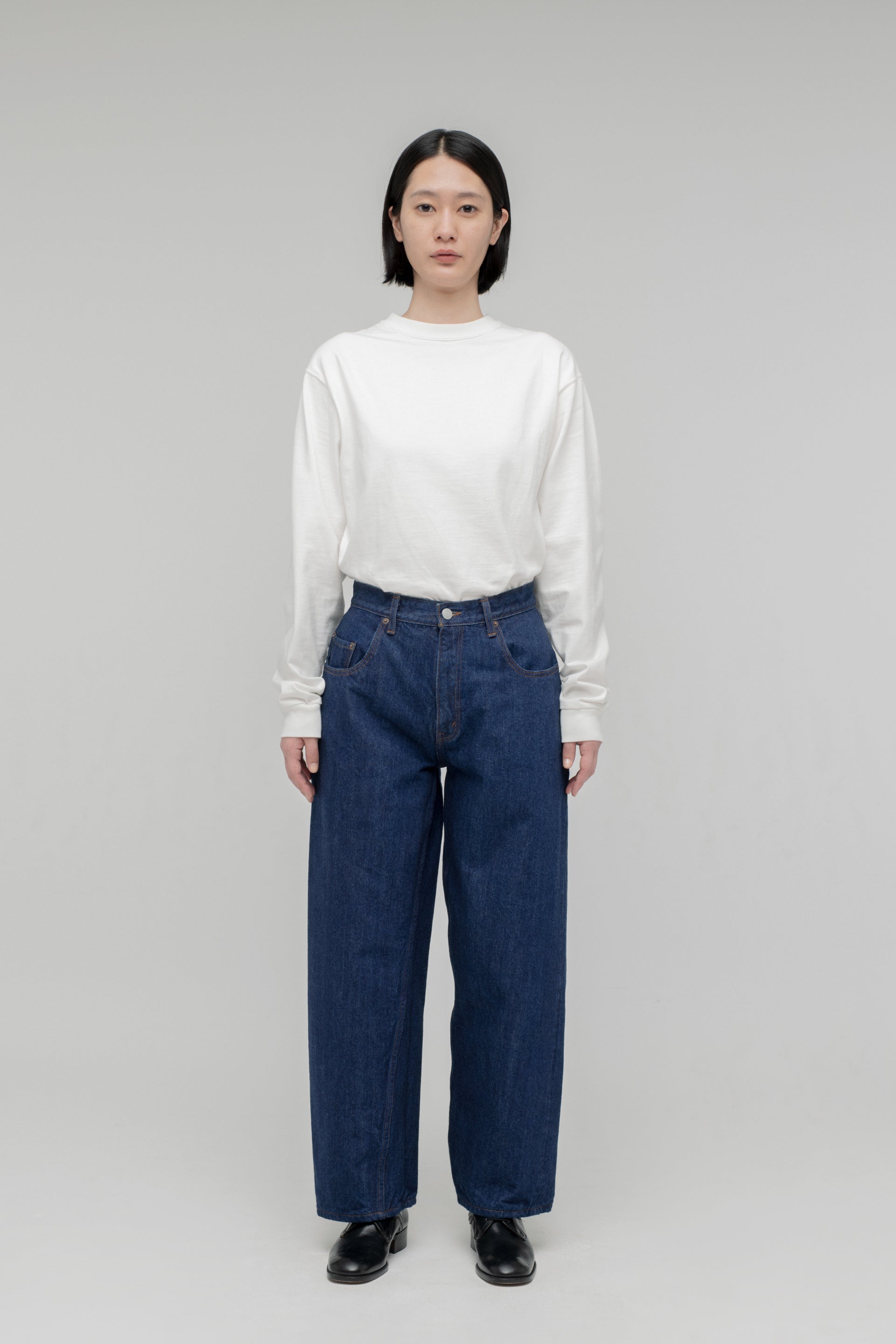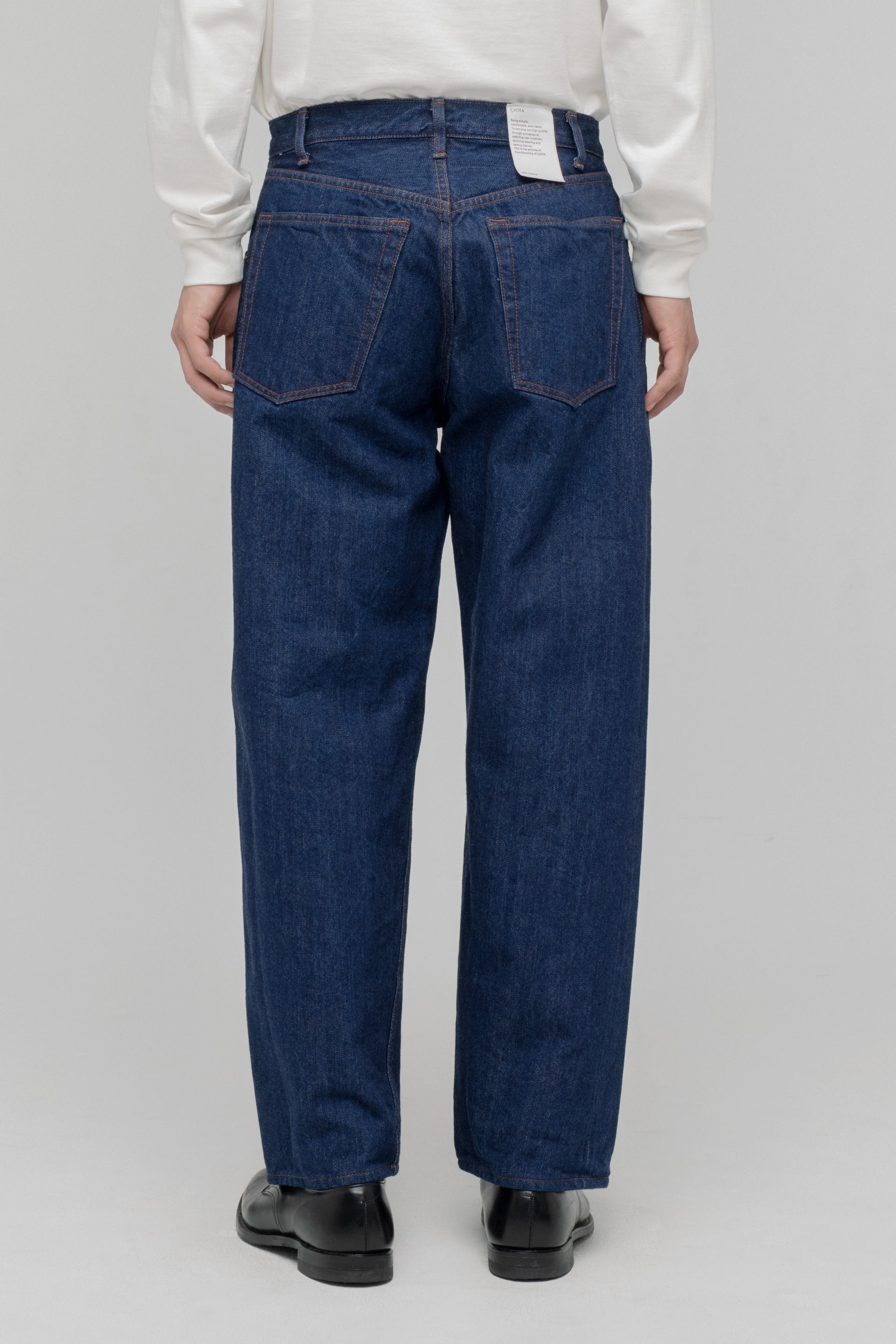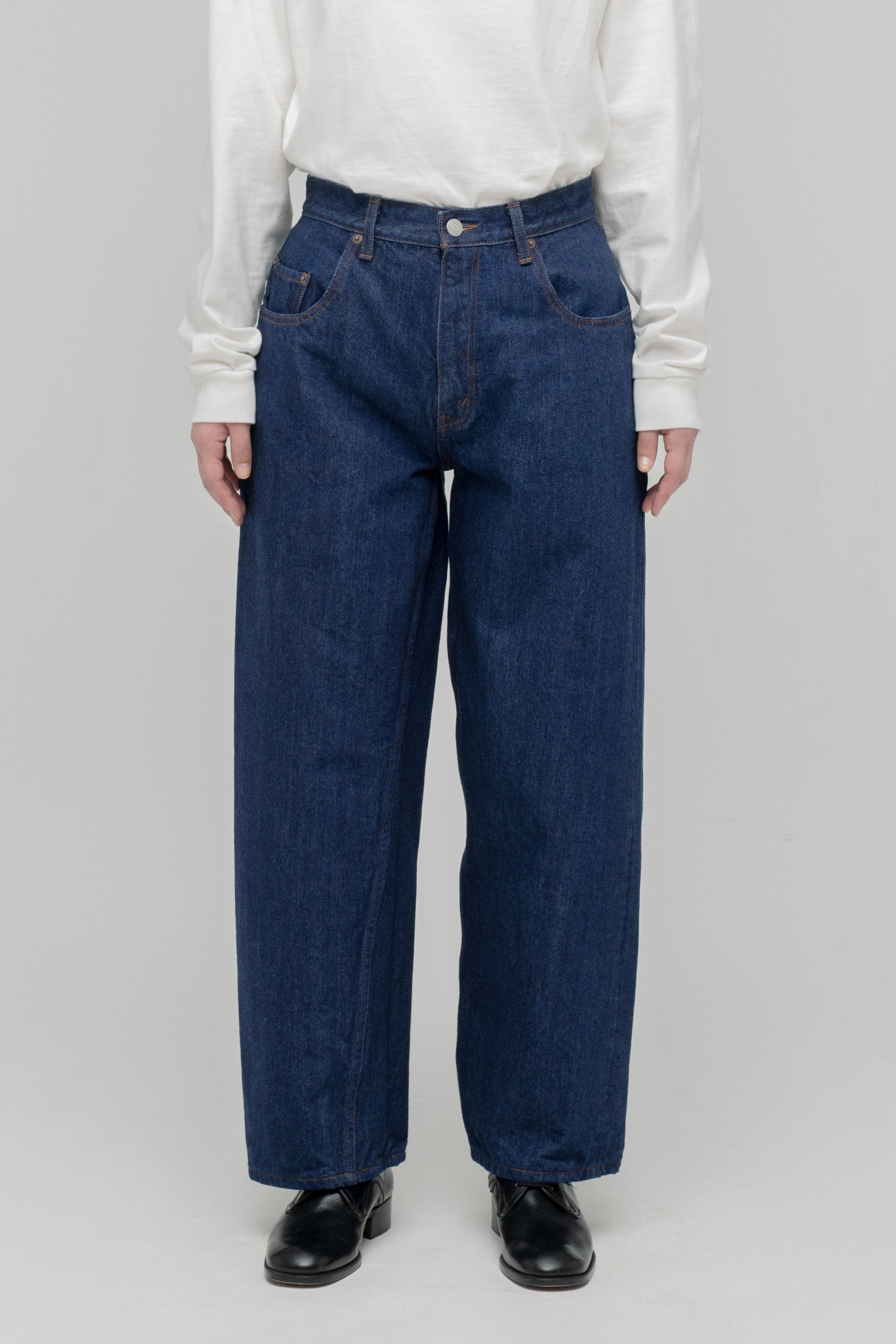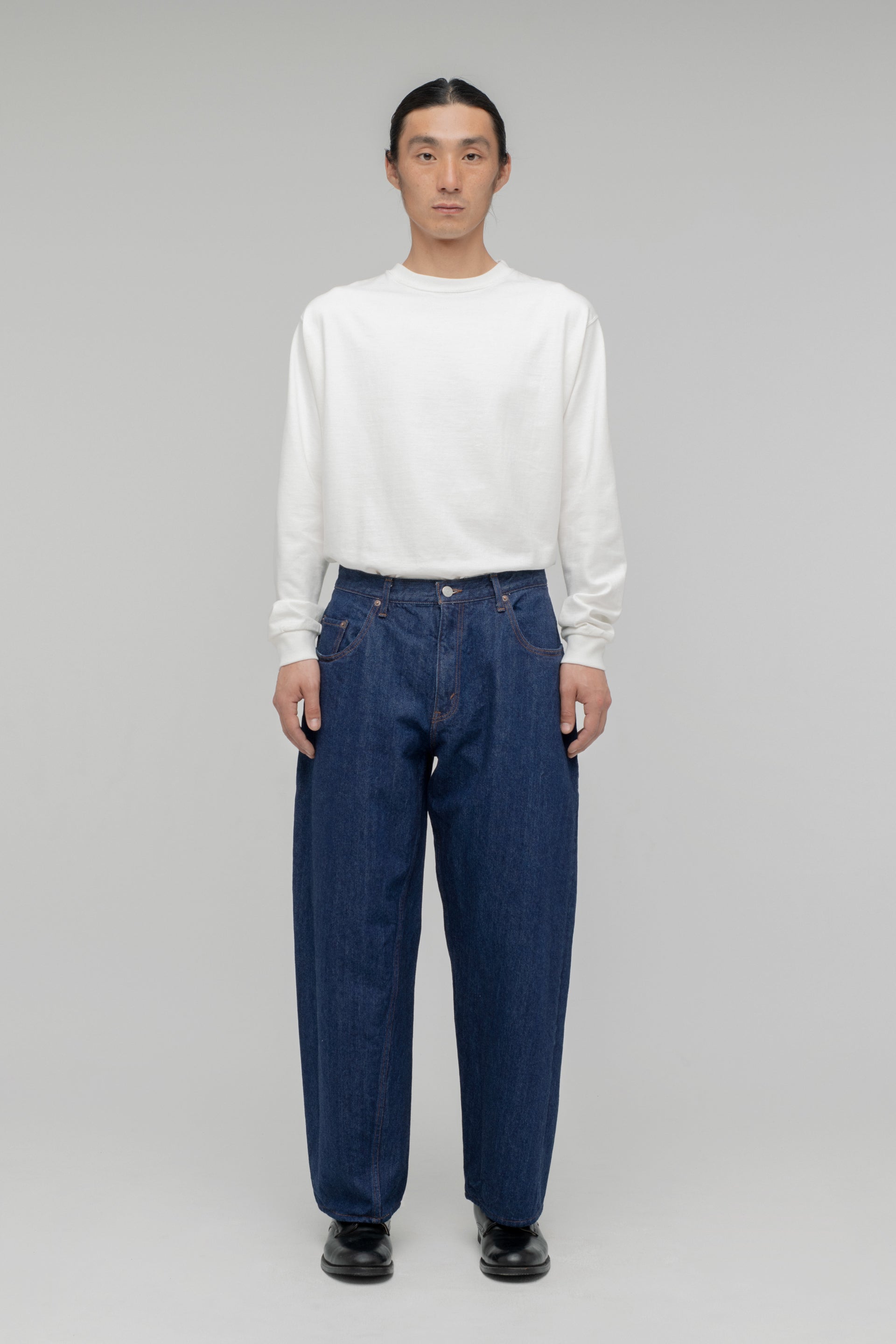 The baggy model sampling the loose-fit jeans of the 1990s has been fully renewed. The silhouette is the same from the loose-fitting crotch to the hems, with a deeper inseam and longer inseam than the old model. The fabric has been changed to a "raw machine" without glue removal, shrink-proofing, anti-straightening or hair burning. The blue denim warp is made of an uneven yarn using synthetic indigo, while the black and grey denim warps are made of a medium white yarn rope-dyed with sulphide dyes. Both weft yarns are made from extra-long delicate cotton, Suvin cotton, and the selvedge denim is finished on an old-style power loom (shuttle loom). These baggies have a new feel that combines a firm texture with supple comfort.