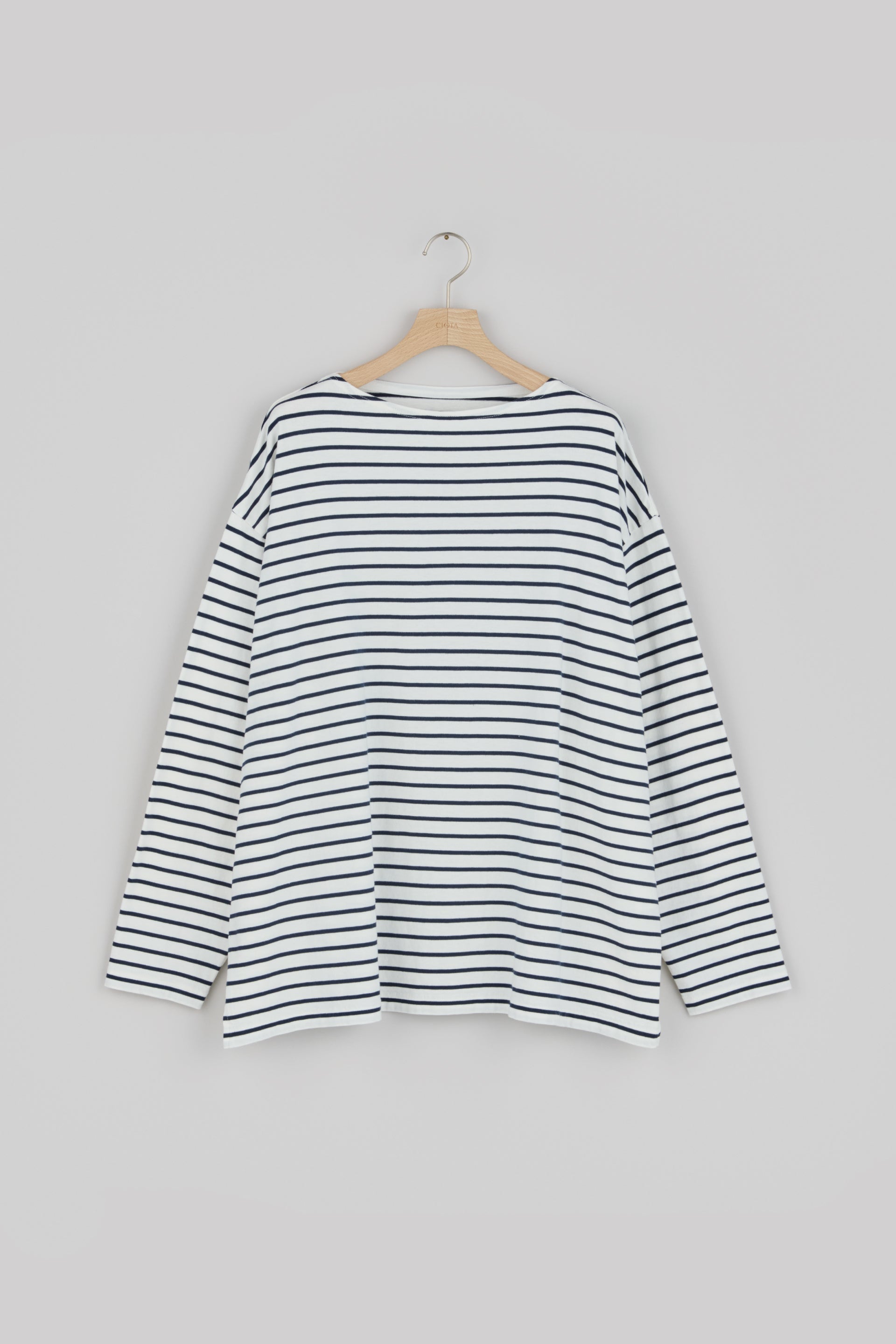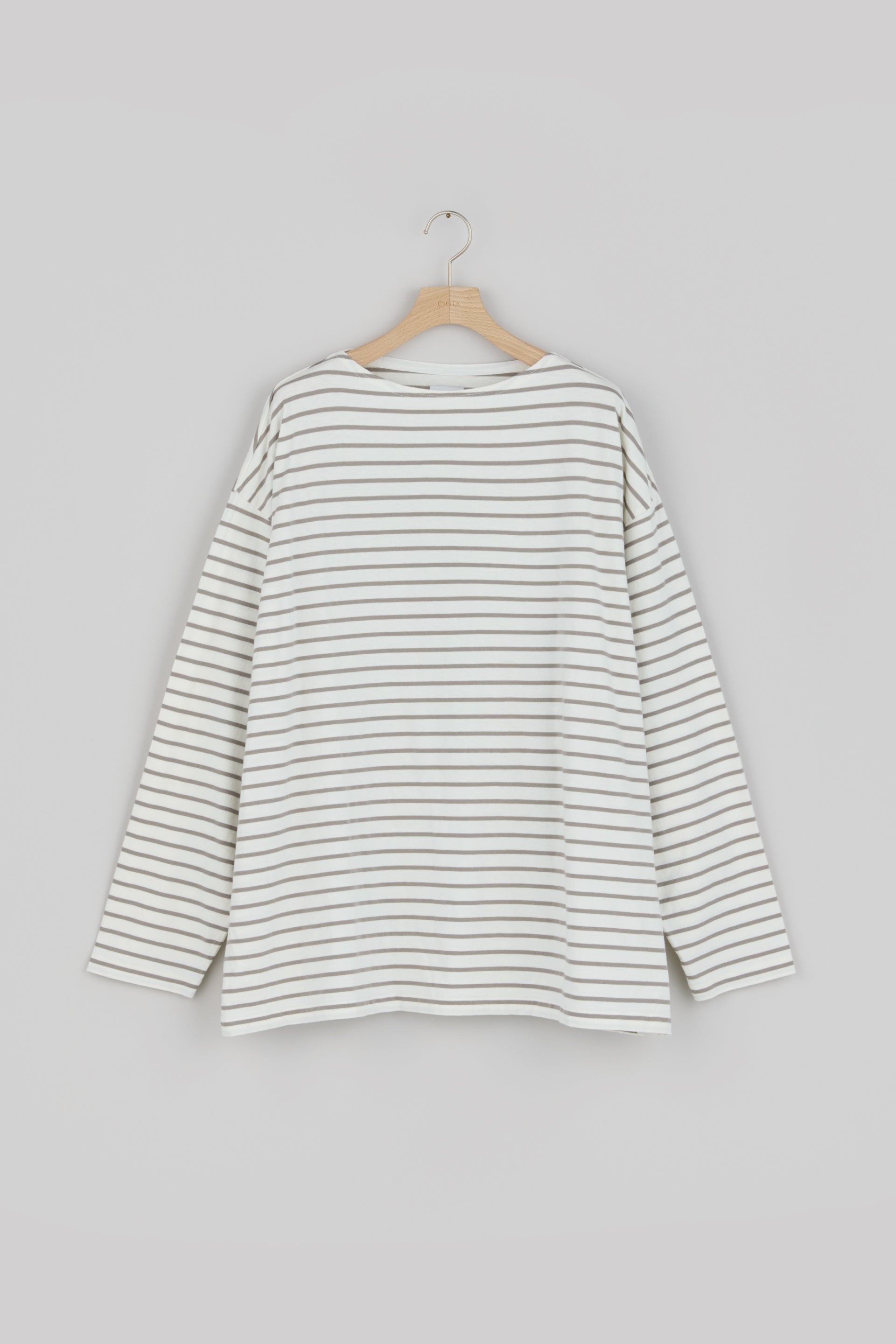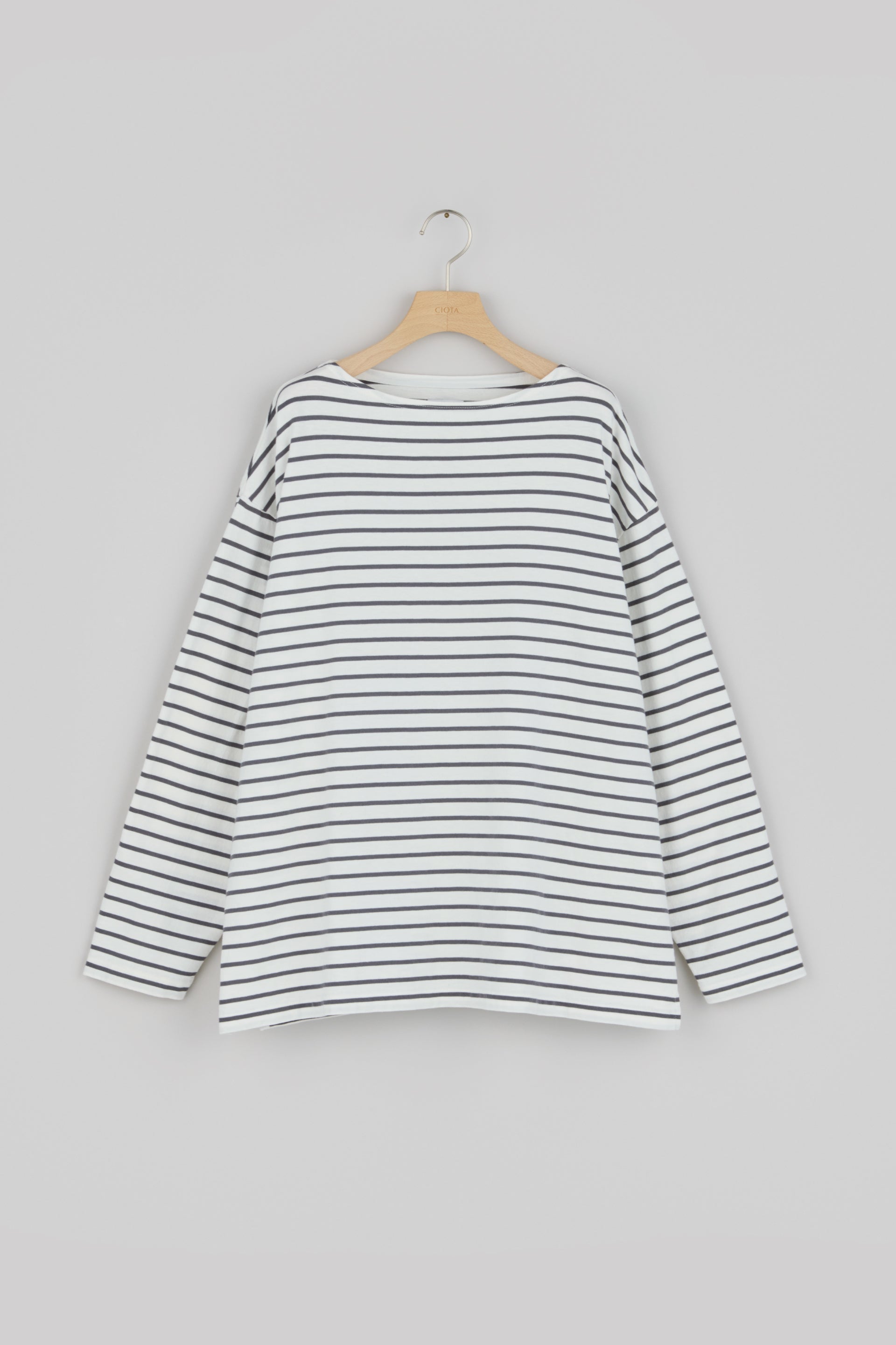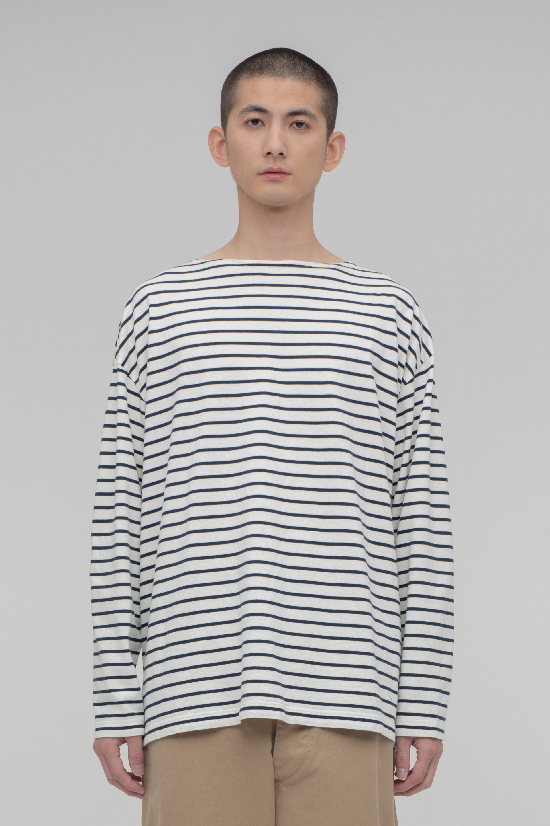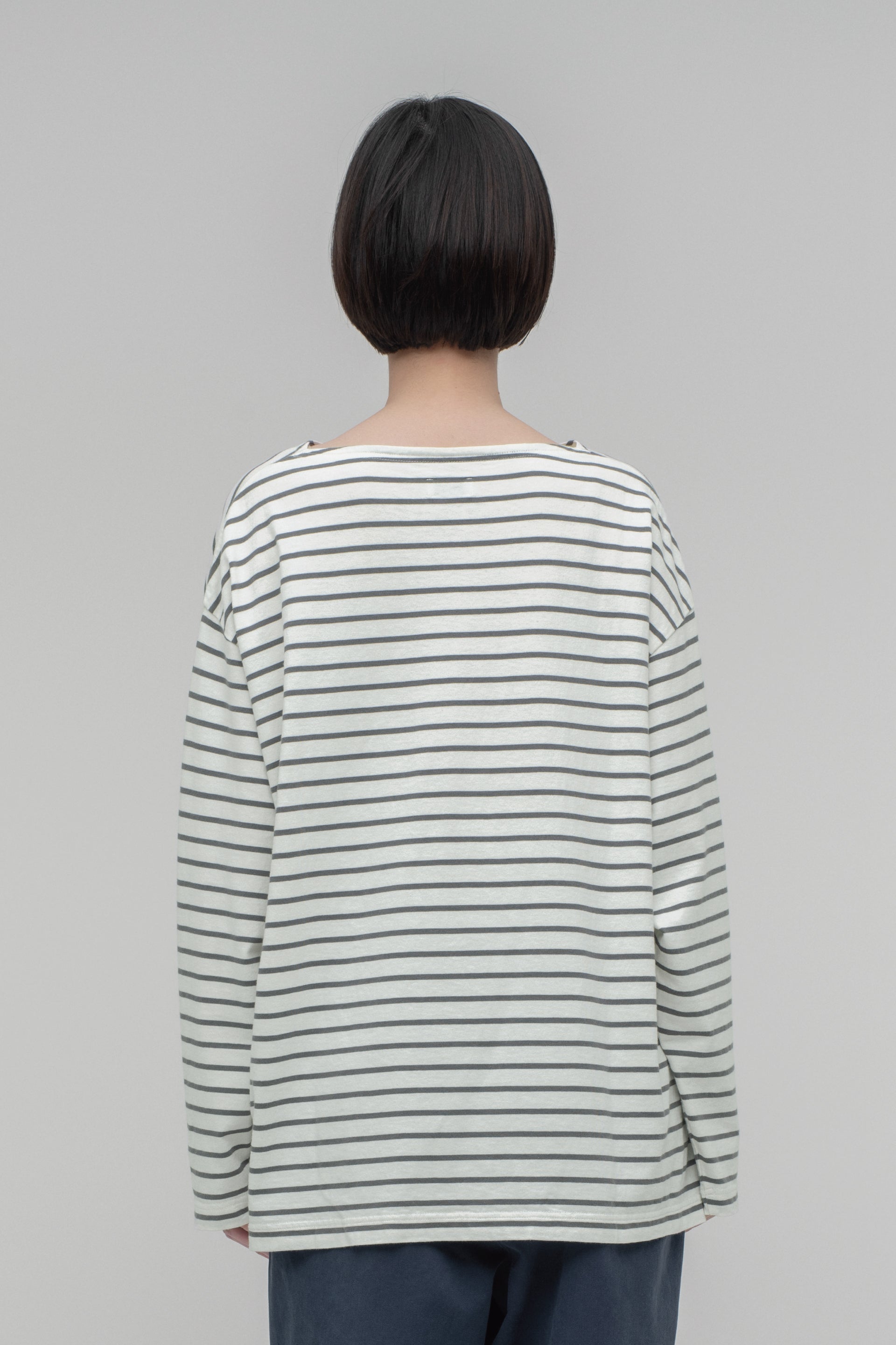 スビンコットンの中でもとりわけ高品質で希少な“スビンゴールド”で作った、ボートネックのボーダーカットソー。デザインはフランスのマリンブランドが1990年代に生産していたビンテージモデルから、生地の質感は1970年代にアメリカで作られていたリバーシブルTシャツを参考にしています。“スビンゴールド”の特性である、シルクのような光沢とカシミヤのような肌触りを最大限に活かすならば、毛羽立ちを抑えるコーミング加工を施すのが一般的ですが、こちらはあえてナチュラルさを残したままのカード糸を使用することで、ヴィンテージのような表情に仕上げました。40番手双糸を選ぶことで、以前にリリースした“Panel Border Shirt”よりもやや薄く春夏シーズンにおすすめ。クタッとしたなめらかな落ち感があり、身体によく馴染みます。
