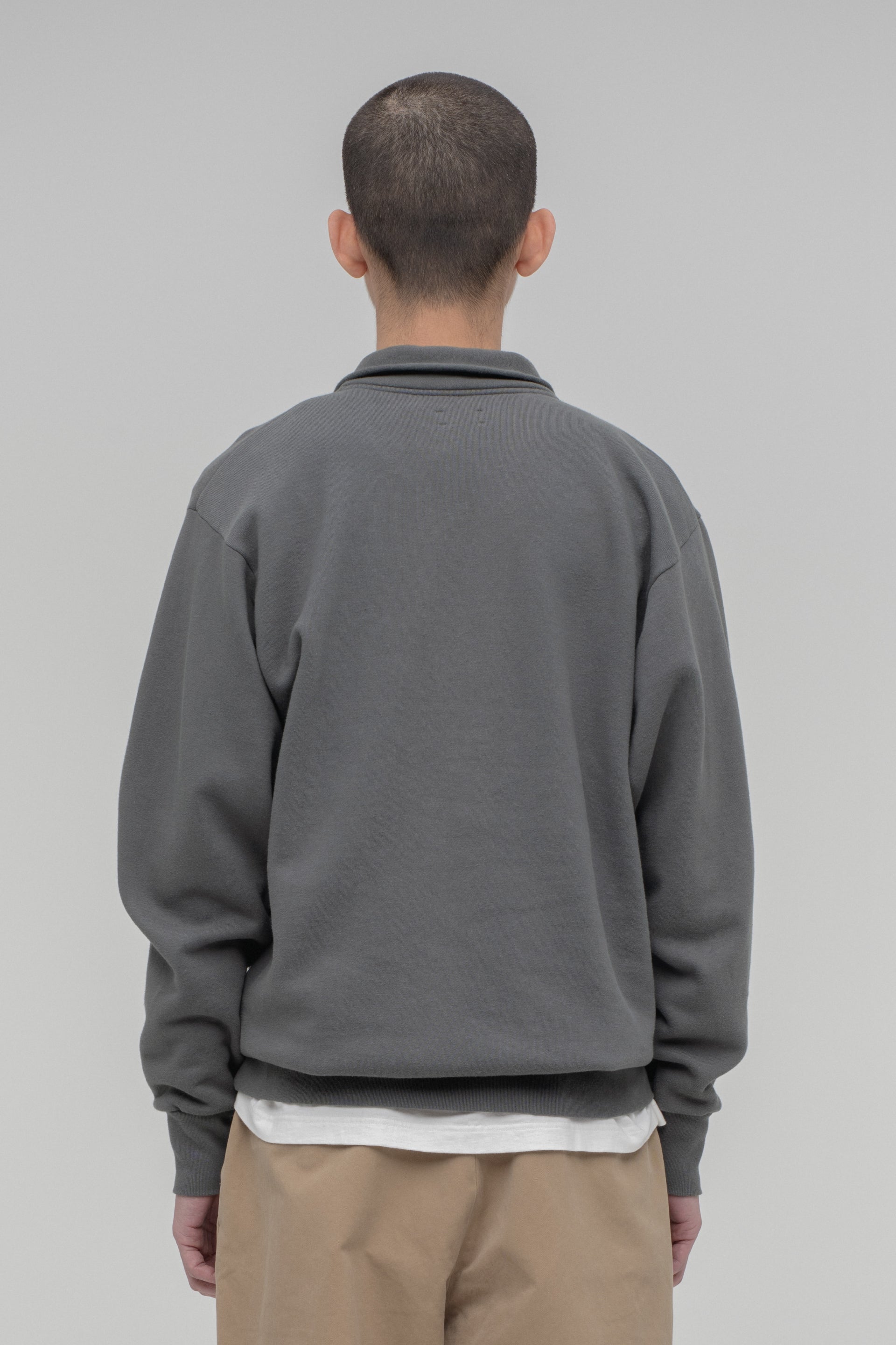 スビンコットンらしい、しっとり、滑らかな肌触りが特徴のスウェットシャツのラインナップに、ハーフジップモデルが加わりました。スビンコットンはその滑らかさや光沢を活かすため、毛羽立ちを抑えるコーミング加工を施すのが一般的ですが、こちらはナチュラルな風合いを残したカード糸を使用。アメリカの1950~60年代の古着のスウェットシャツのような、着古し感のある表情に仕上げています。定番の“Crewneck Sweatshirt”よりもやや軽い着心地。袖口、裾口のリブがしっかりしているので、ワンサイズアップして、ゆったりと着るのが気分です。