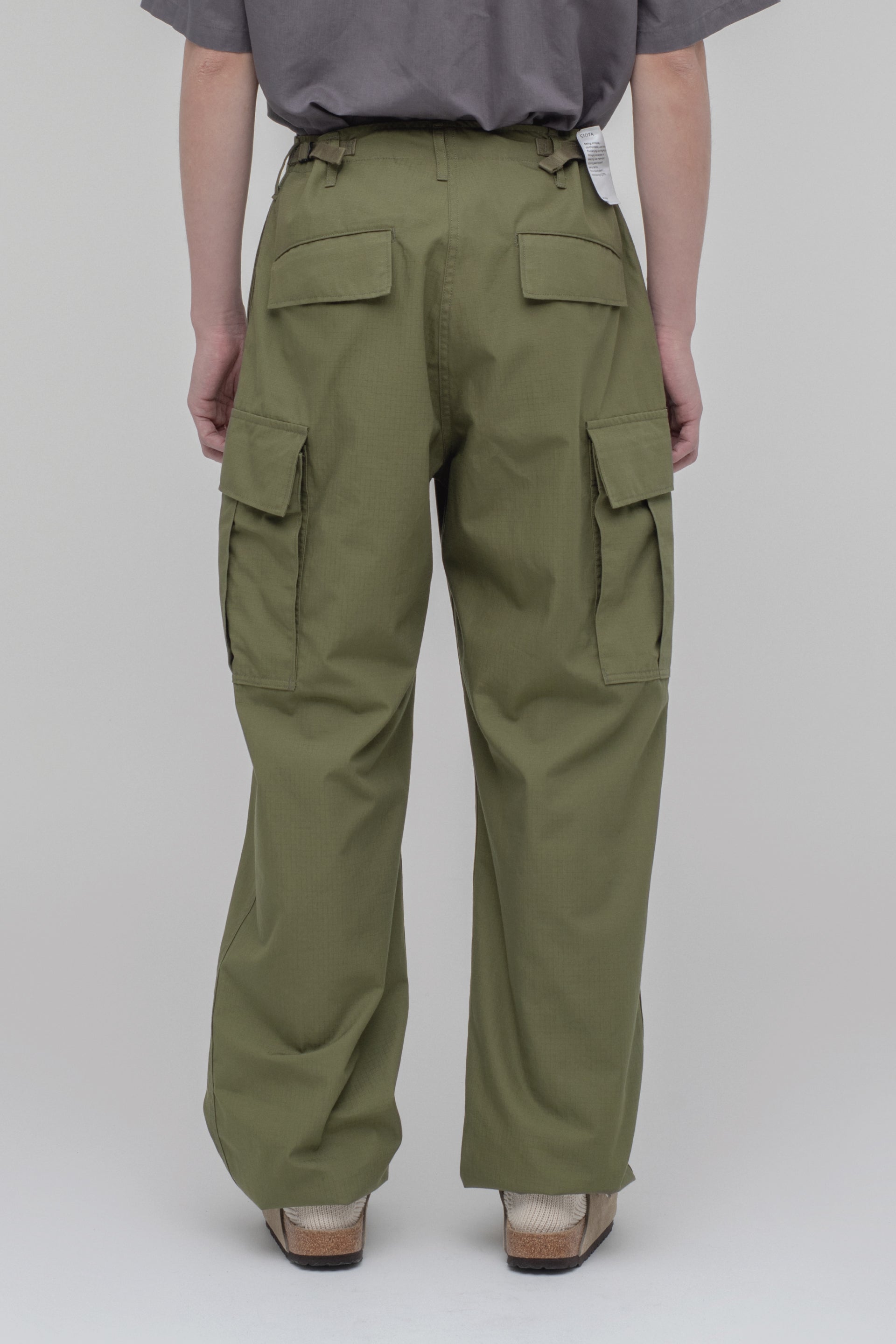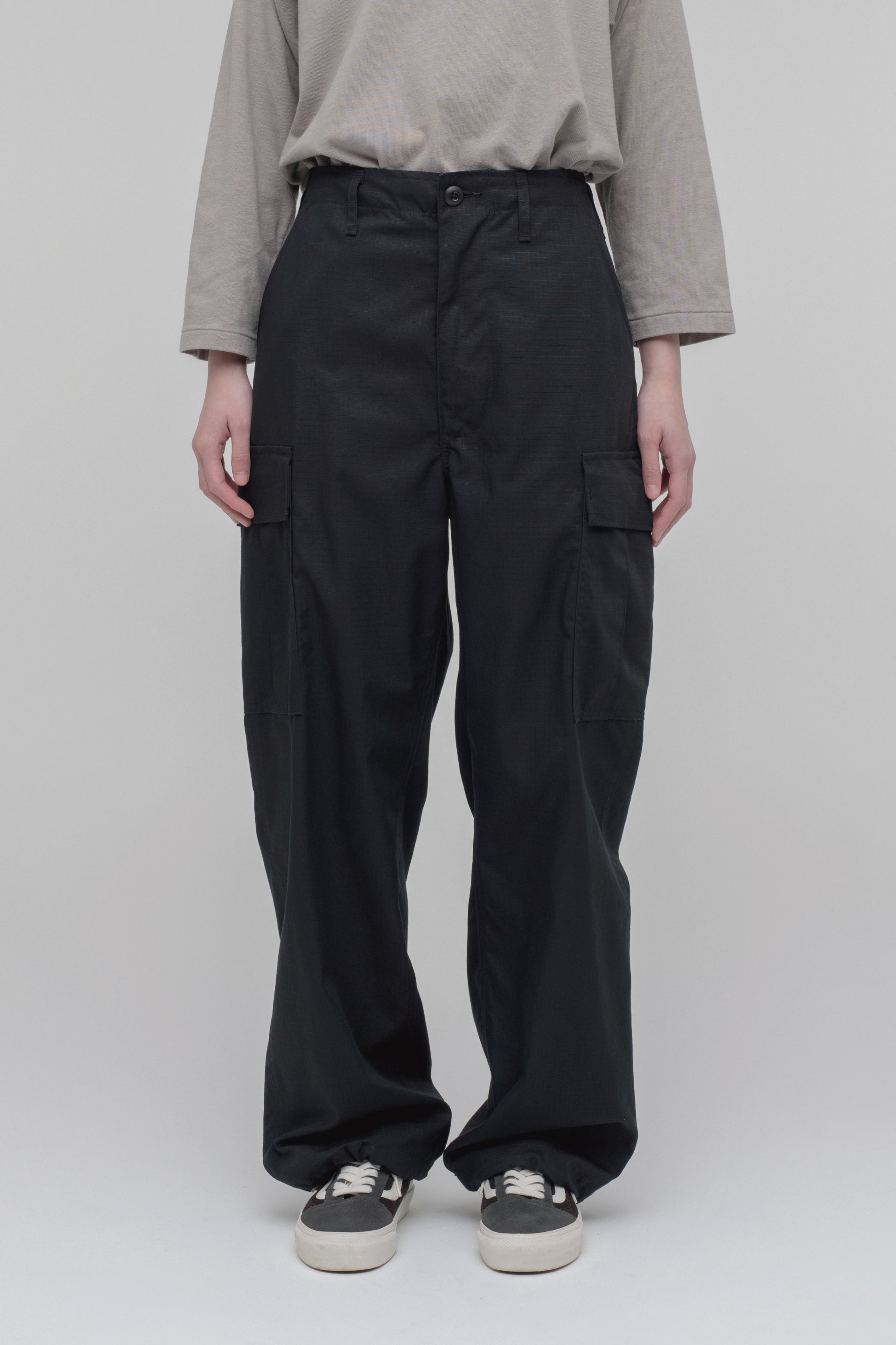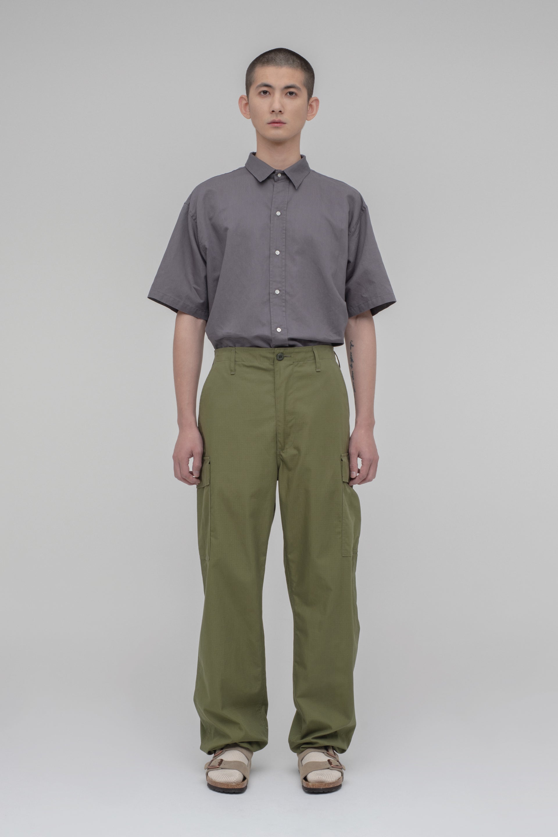 スビンコットン100%のリップストップファブリックで作ったジャングルファティーグパンツのニューモデル。パターンを見直し、ワイドシルエットにアップデートしました。デザインのモチーフは、USアーミーの5thタイプ。CIOTAが定番展開するウェザー(平織り)クロスの3rdタイプモデルと比べて、少しゆったりとしたシルエットです。フロントはジッパーフライ、裾にはスタイルを変えられるドローコード入り。ミリタリーアイテムですが、超長繊細綿・スビンコットン特有のしなやかさと光沢感による上品なルックスが特徴です。