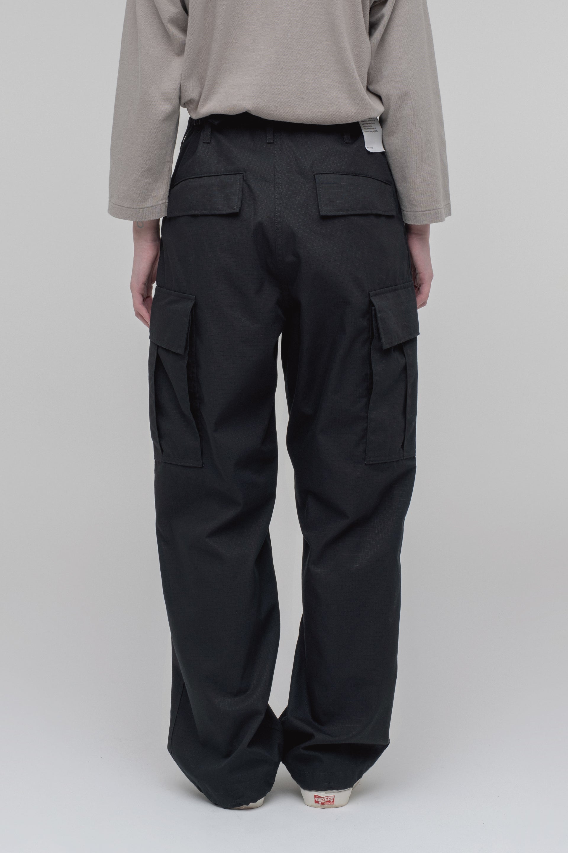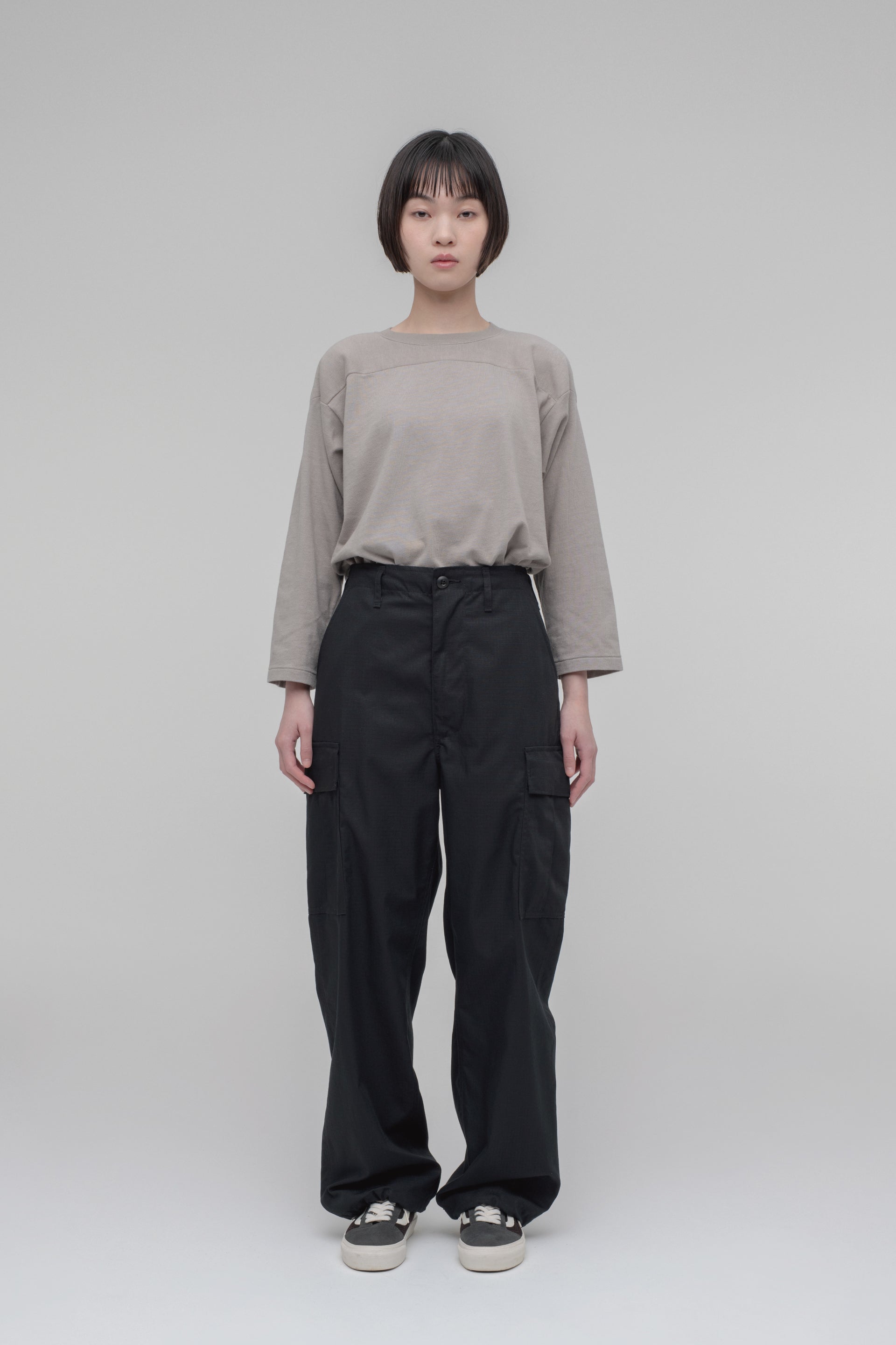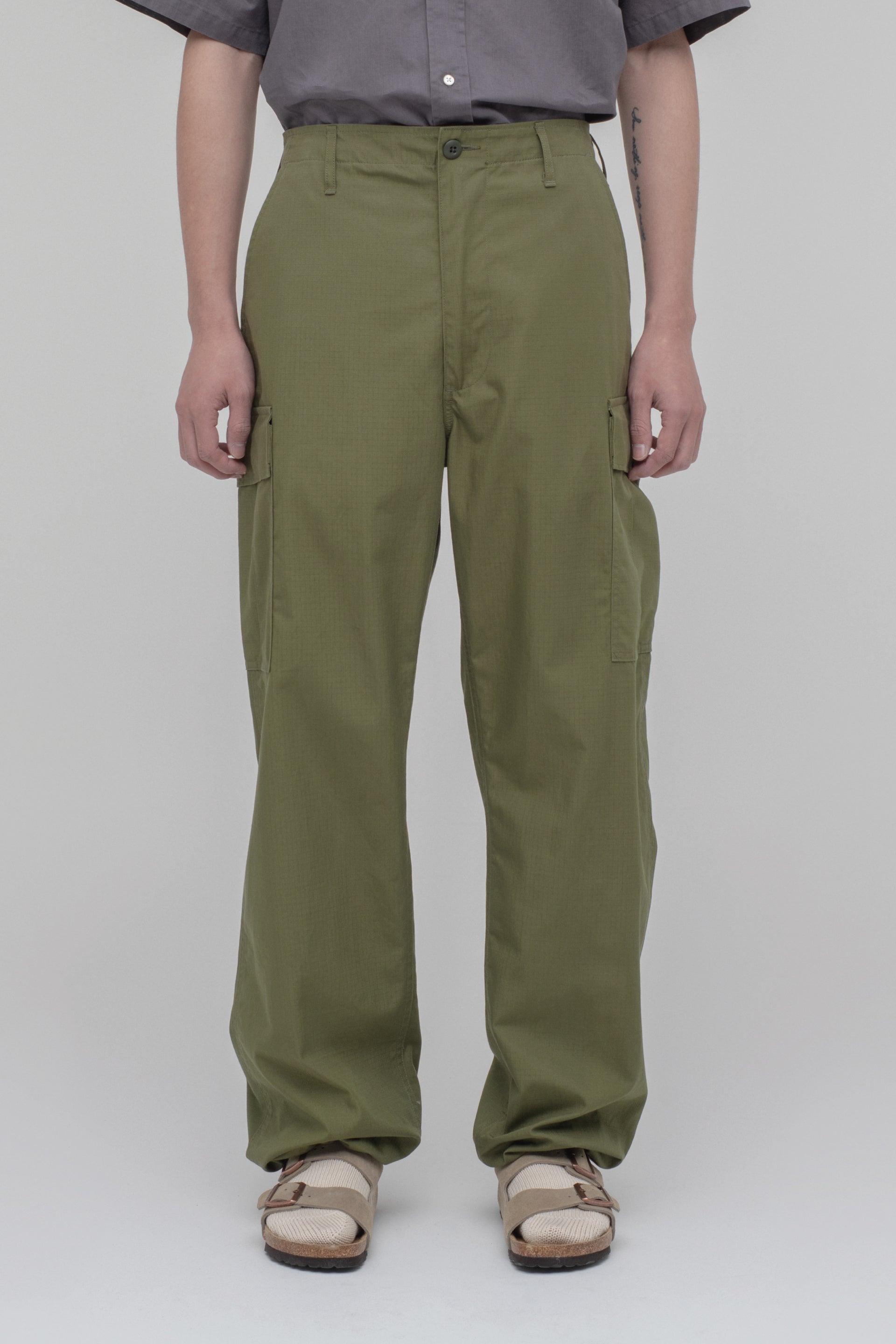 スビンコットン100%のリップストップファブリックで作ったジャングルファティーグパンツのニューモデル。パターンを見直し、ワイドシルエットにアップデートしました。デザインのモチーフは、USアーミーの5thタイプ。CIOTAが定番展開するウェザー(平織り)クロスの3rdタイプモデルと比べて、少しゆったりとしたシルエットです。フロントはジッパーフライ、裾にはスタイルを変えられるドローコード入り。ミリタリーアイテムですが、超長繊細綿・スビンコットン特有のしなやかさと光沢感による上品なルックスが特徴です。