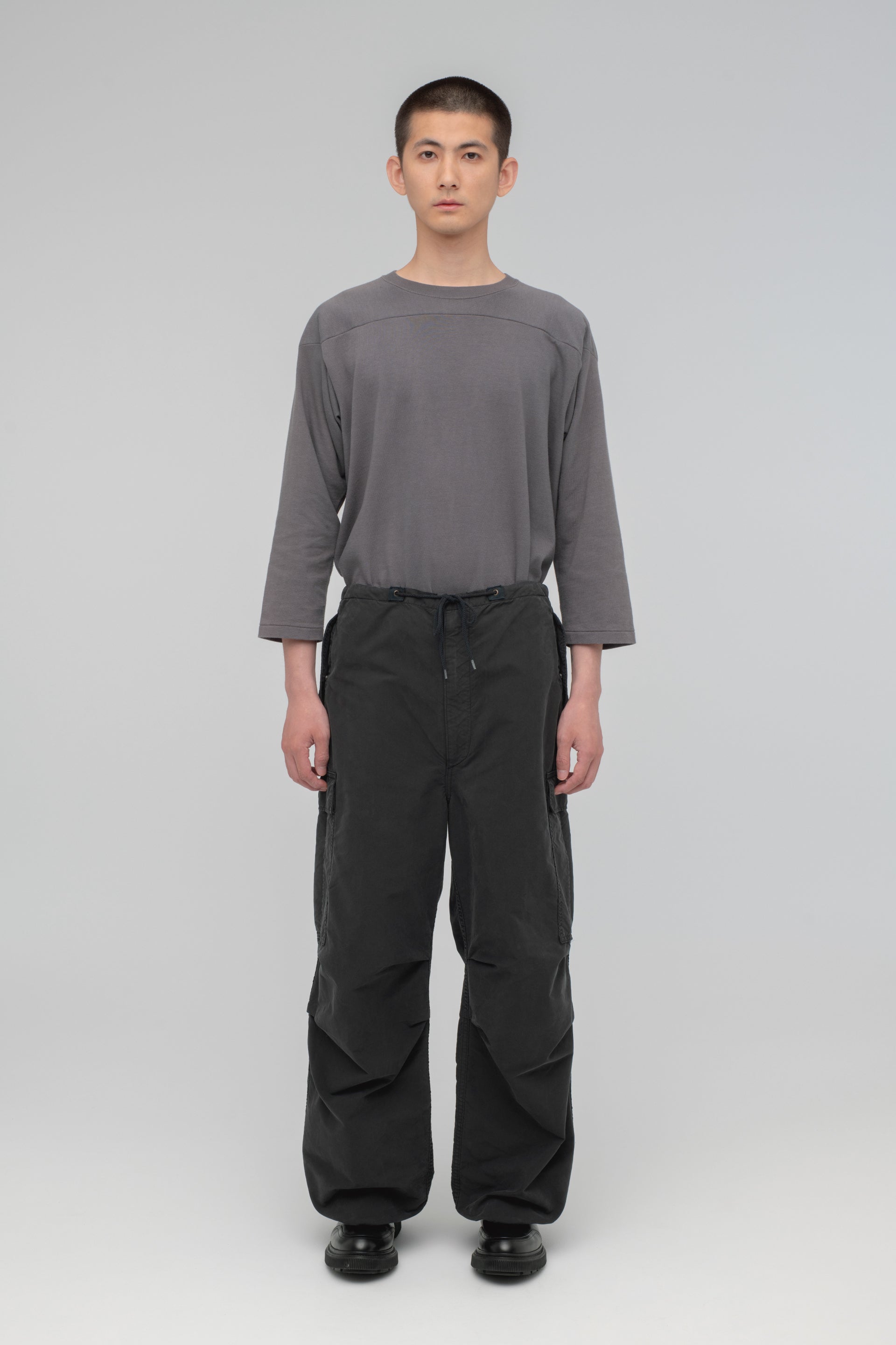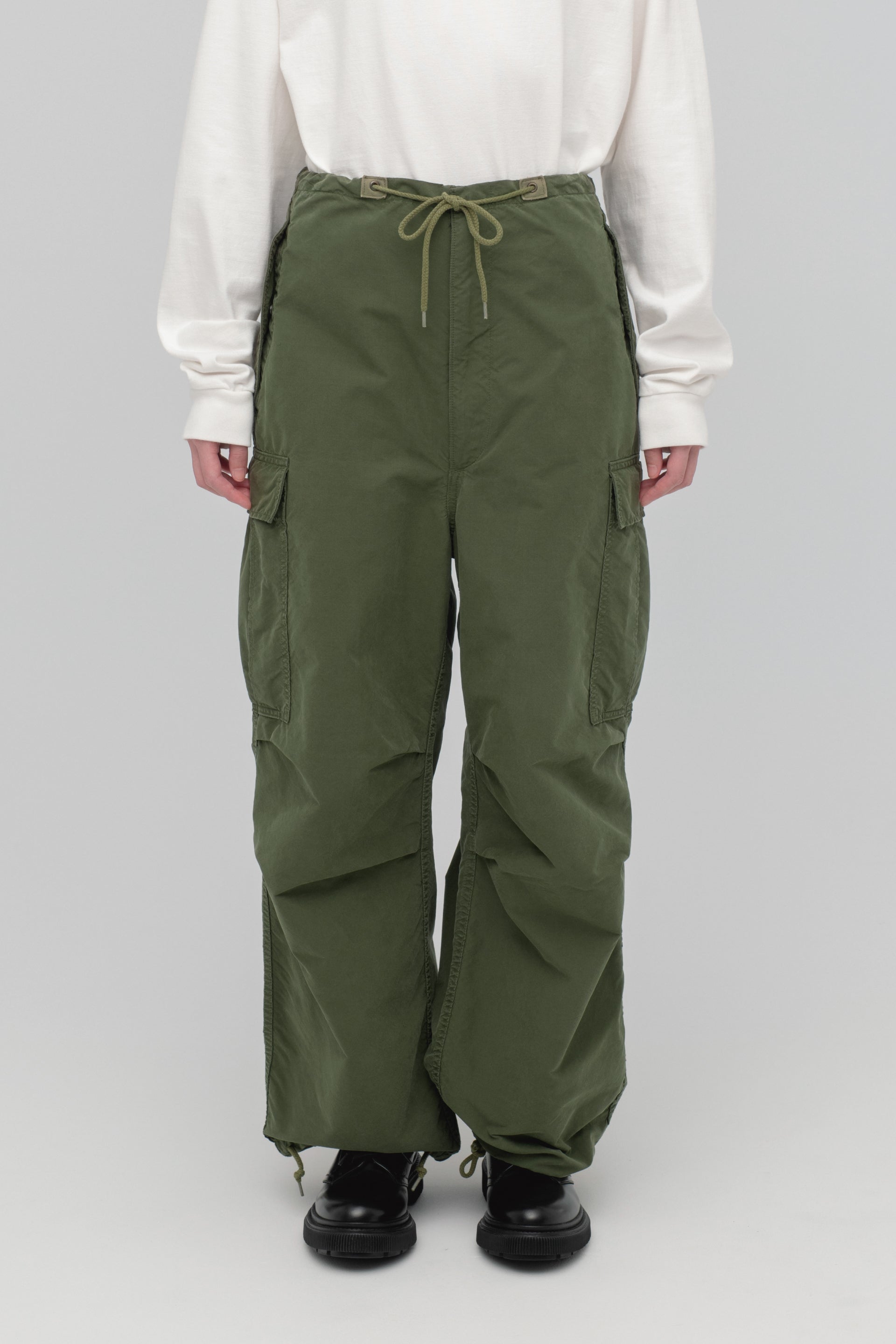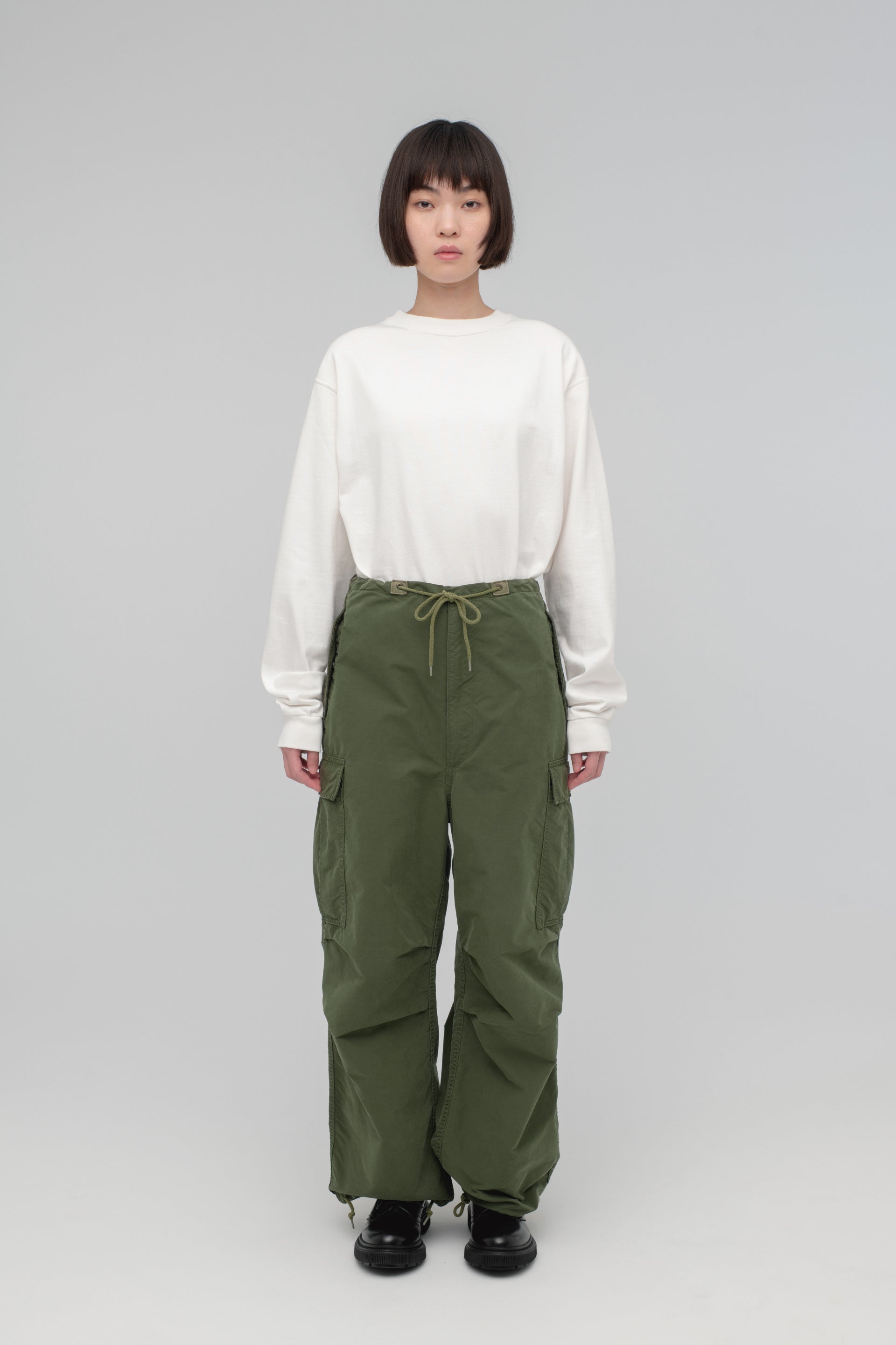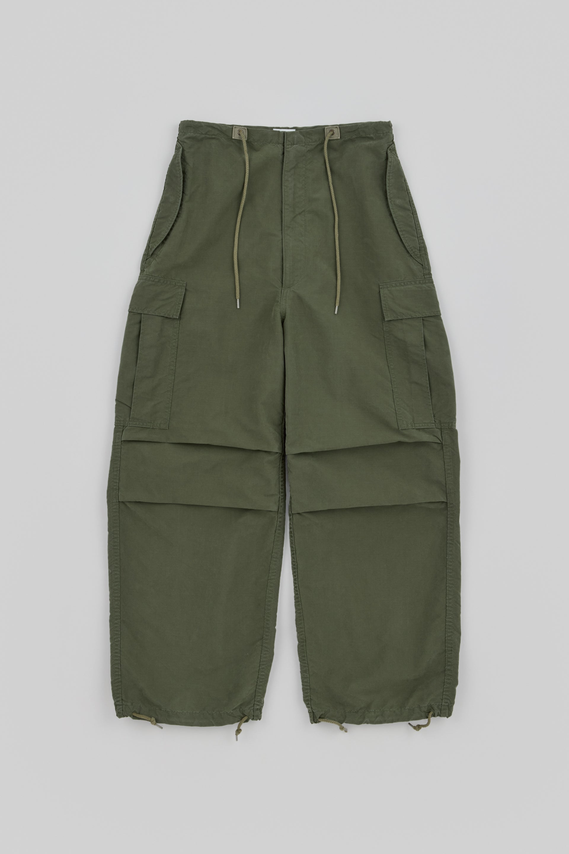 フィールドパンツの上からはくウインドブレーカーとして、1951年からアメリカ海兵隊で採用されていた、M-51ウインドオーバーパンツをサンプリング。生地は、超細番手のスビンコットンと210デニールのナイロンを高密度で交織したオリジナルのオックスフォード。スビンコットン特有の光沢やしなやかさと、ナイロンのハリ感がミックスされ、無骨さとエレガントが共存する独特の風合いに。オーバーパンツゆえの超ワイドシルエットを立体的に際立たせます。ウエストと裾のドローコードを絞ってフォルムの変化が楽しめます。
