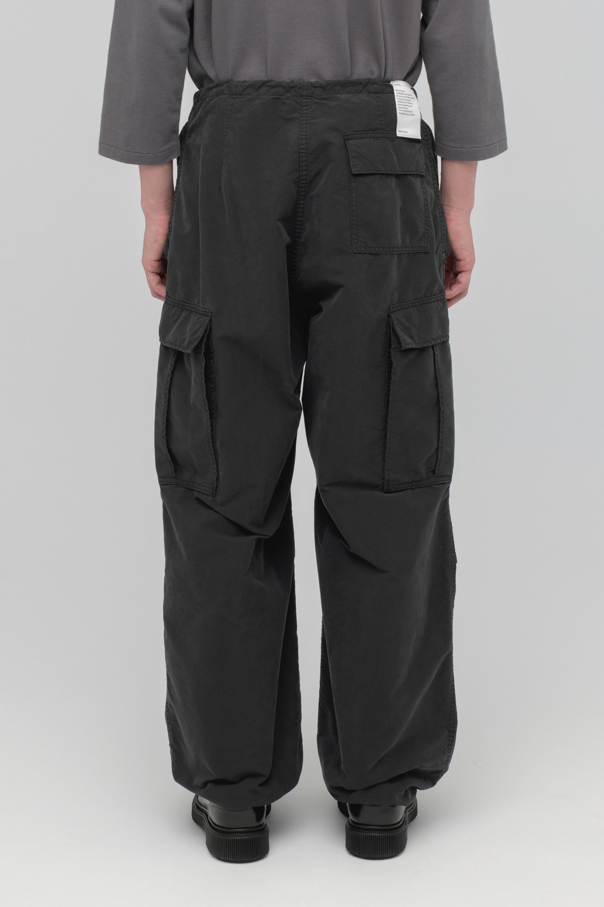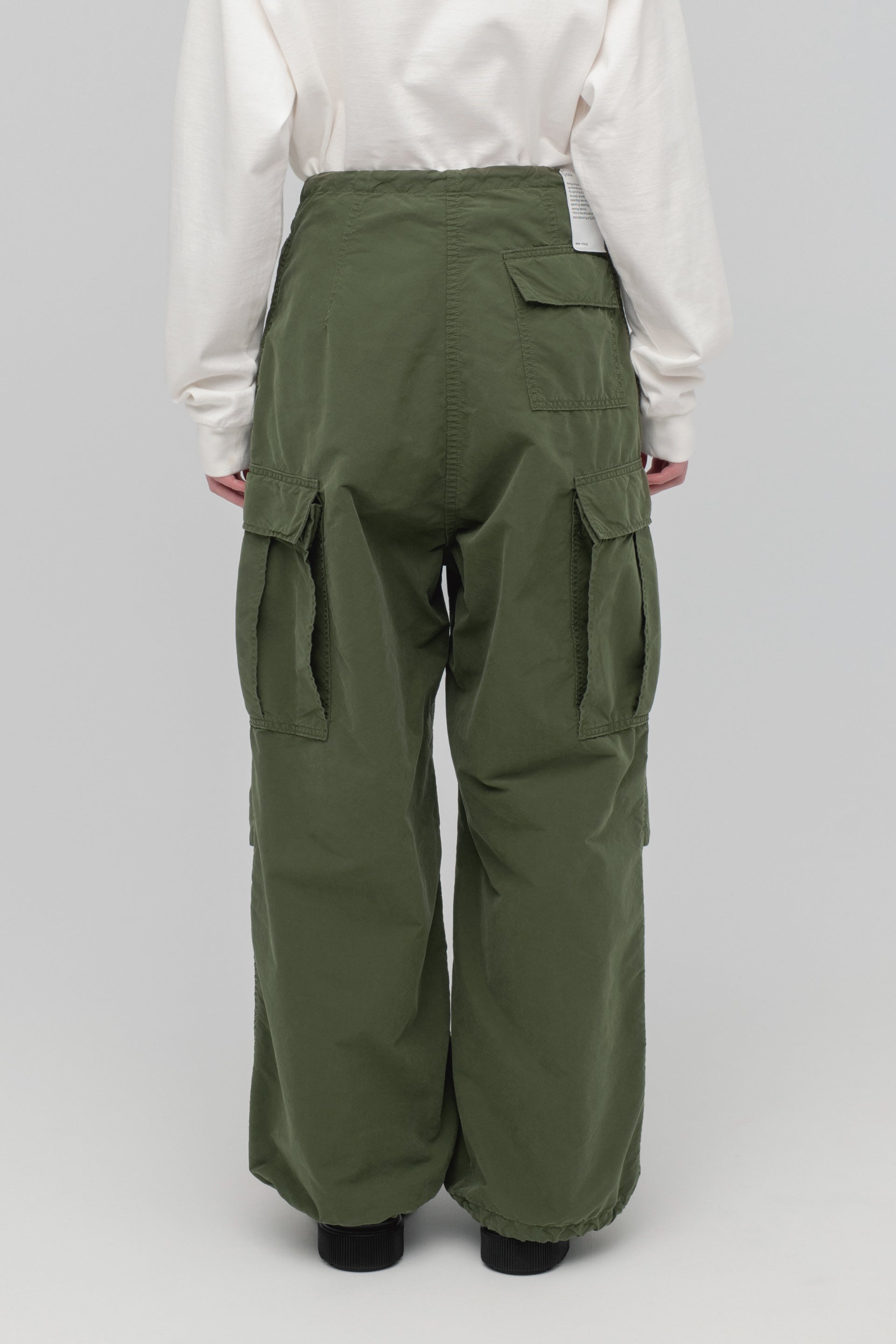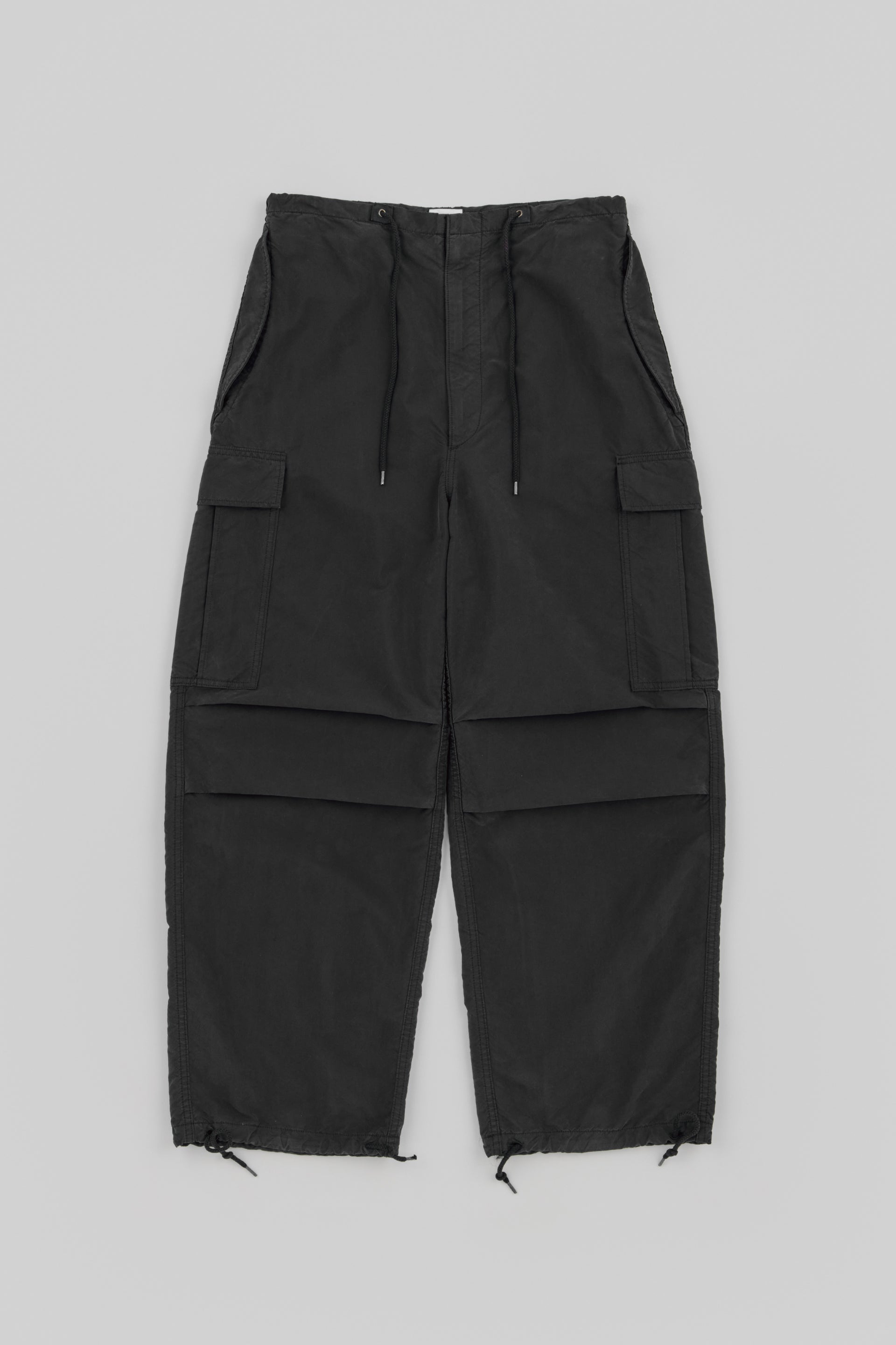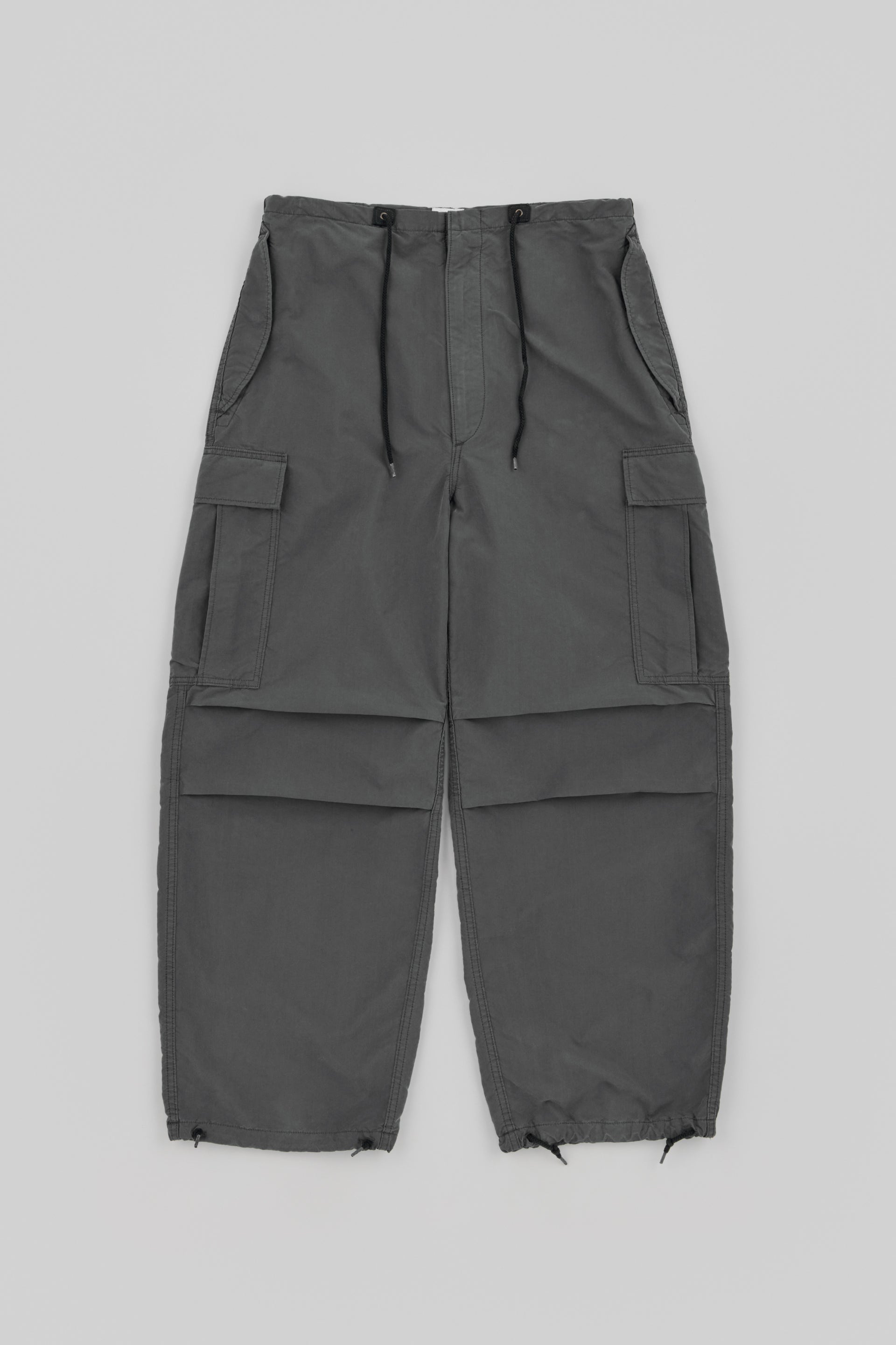 フィールドパンツの上からはくウインドブレーカーとして、1951年からアメリカ海兵隊で採用されていた、M-51ウインドオーバーパンツをサンプリング。生地は、超細番手のスビンコットンと210デニールのナイロンを高密度で交織したオリジナルのオックスフォード。スビンコットン特有の光沢やしなやかさと、ナイロンのハリ感がミックスされ、無骨さとエレガントが共存する独特の風合いに。オーバーパンツゆえの超ワイドシルエットを立体的に際立たせます。ウエストと裾のドローコードを絞ってフォルムの変化が楽しめます。