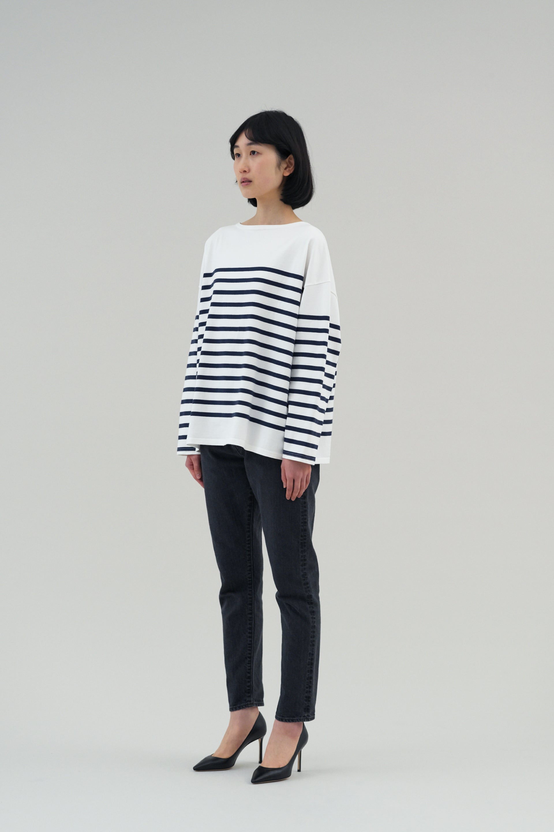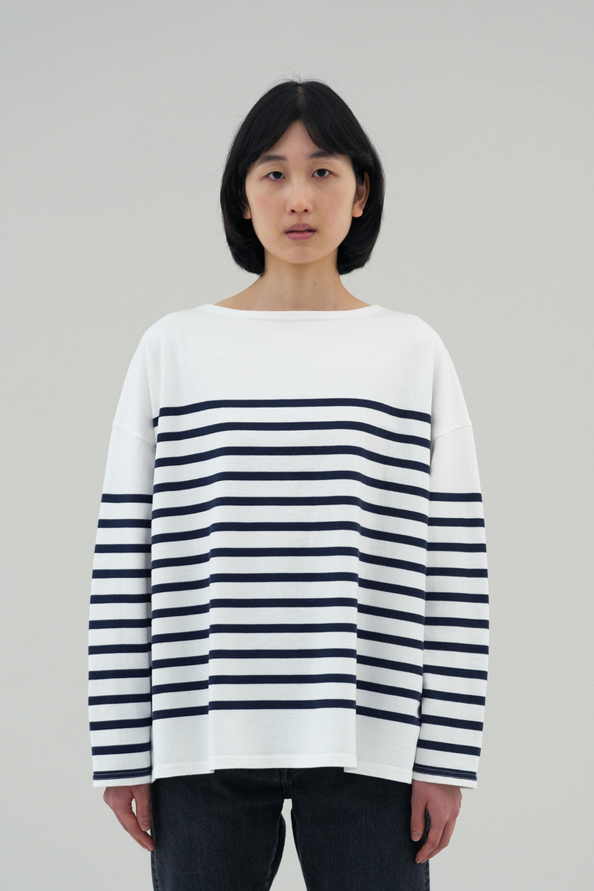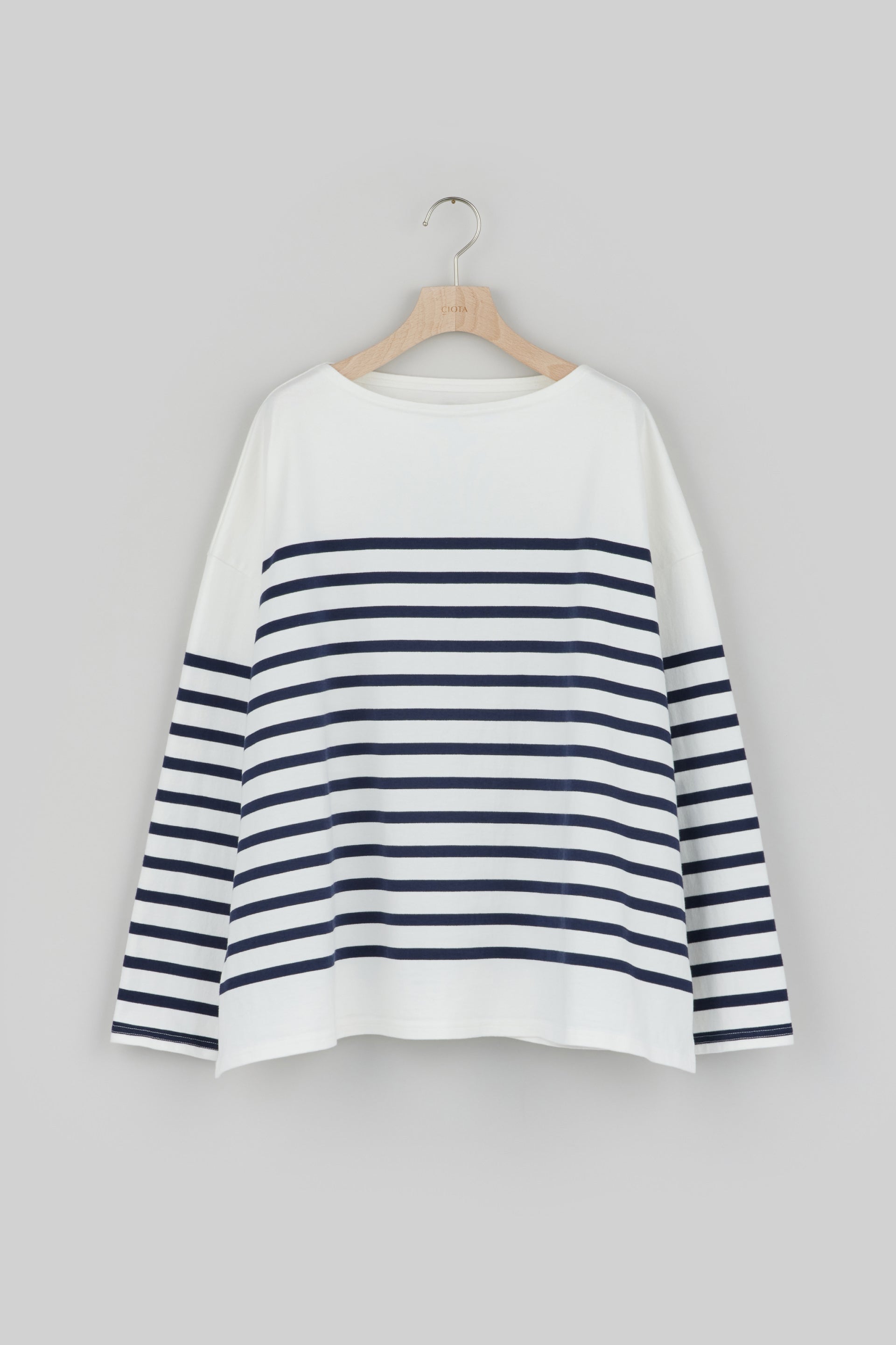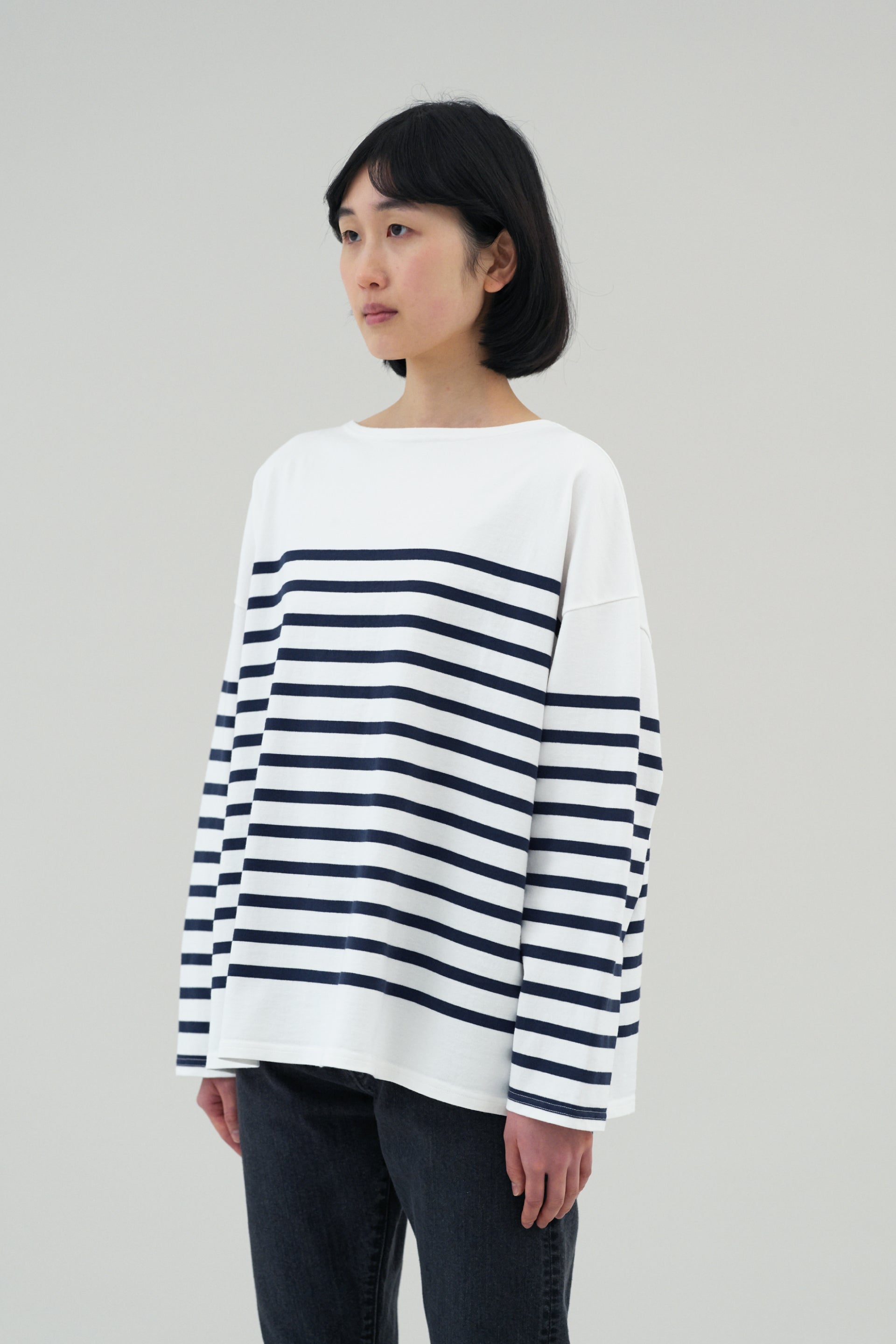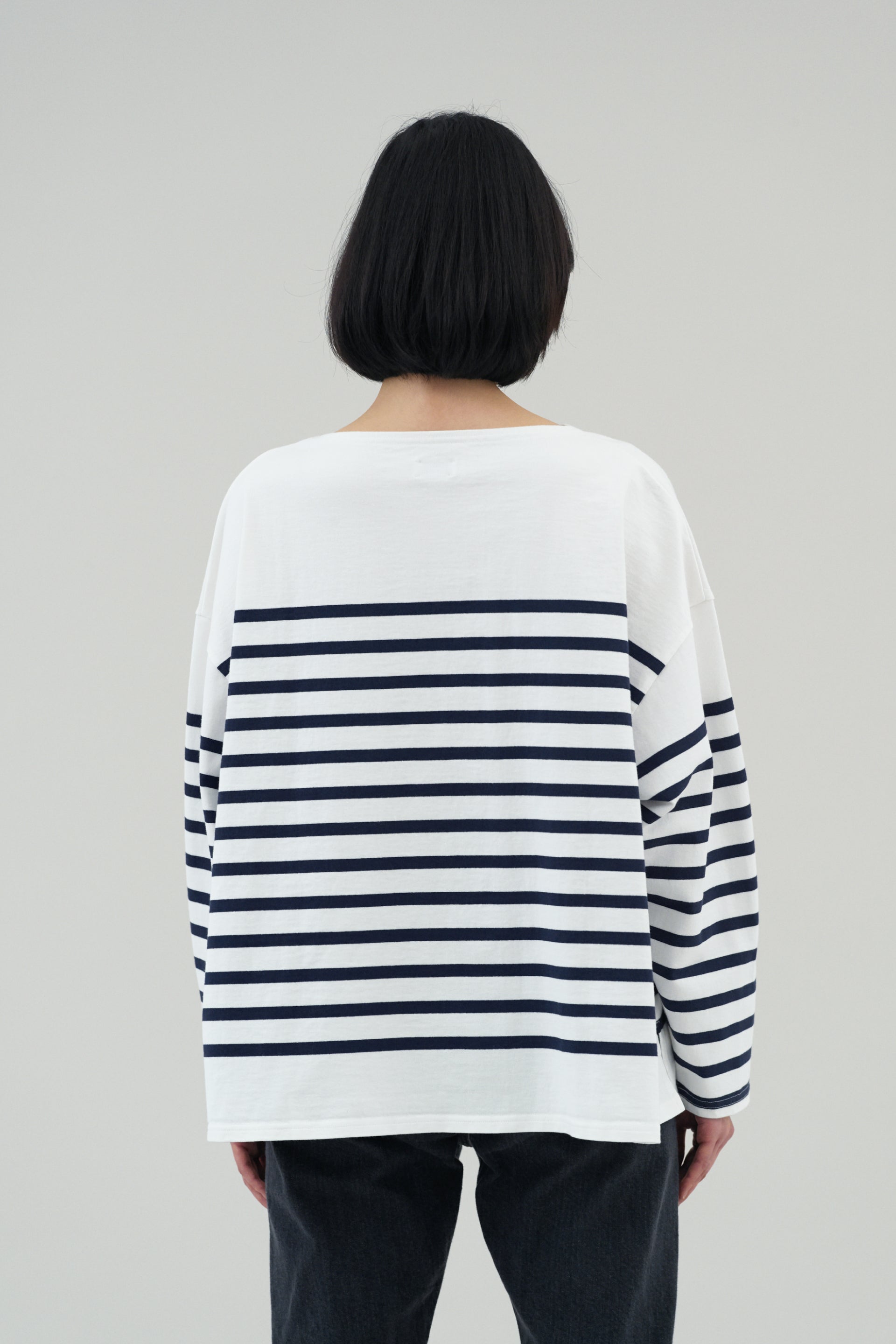 ベーシックなボートネックのバスクシャツをワイドフィットにアレンジ。いちばんこだわったのは風合いです。使用した糸は、しっかりとした20番手双糸のスビンコットン。それを吊編み機でゆっくりと時間をかけて編み立てたパネルボーダーは、肉厚で柔らかく滑らか。抜群の肌触りをお楽しみいただけます。