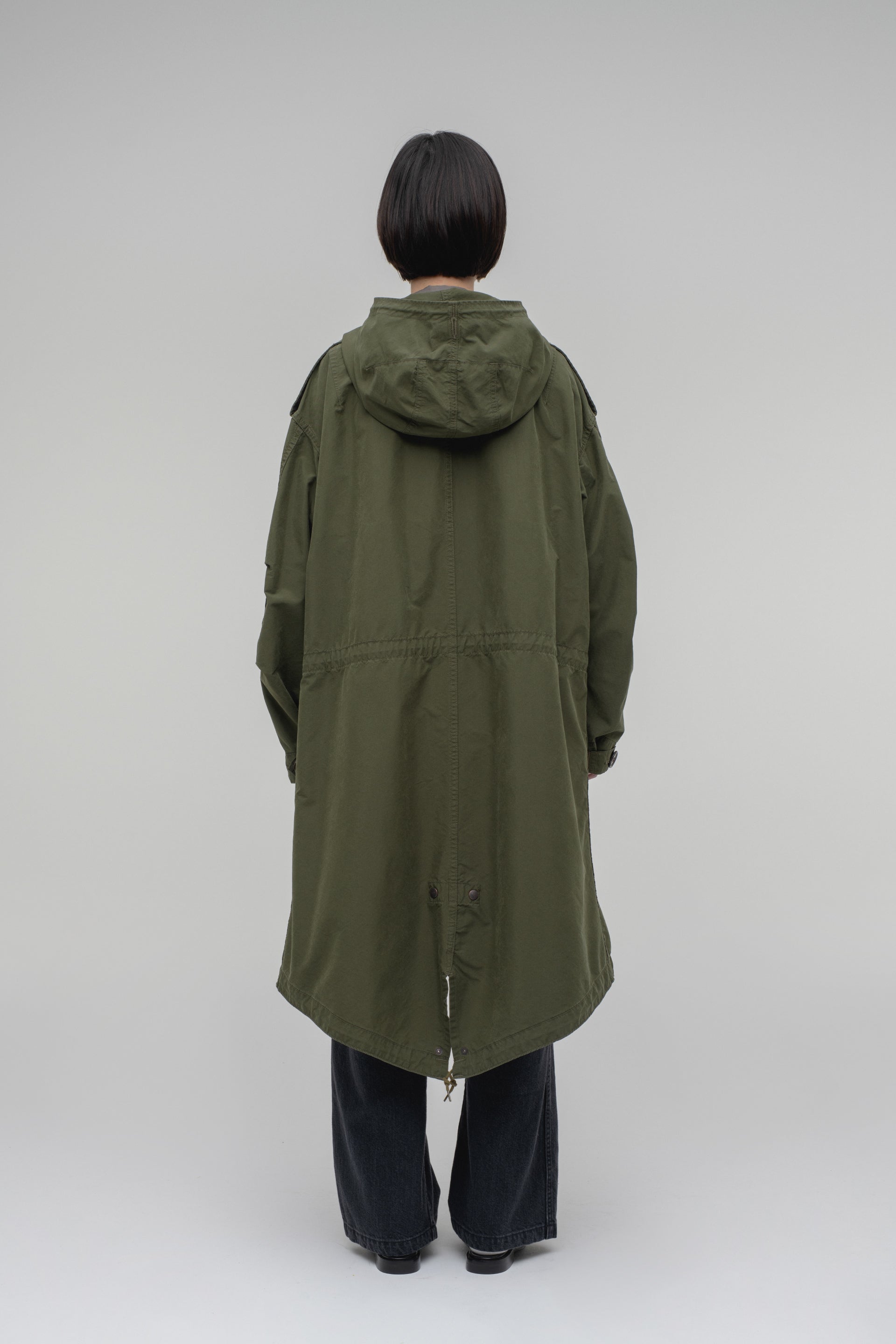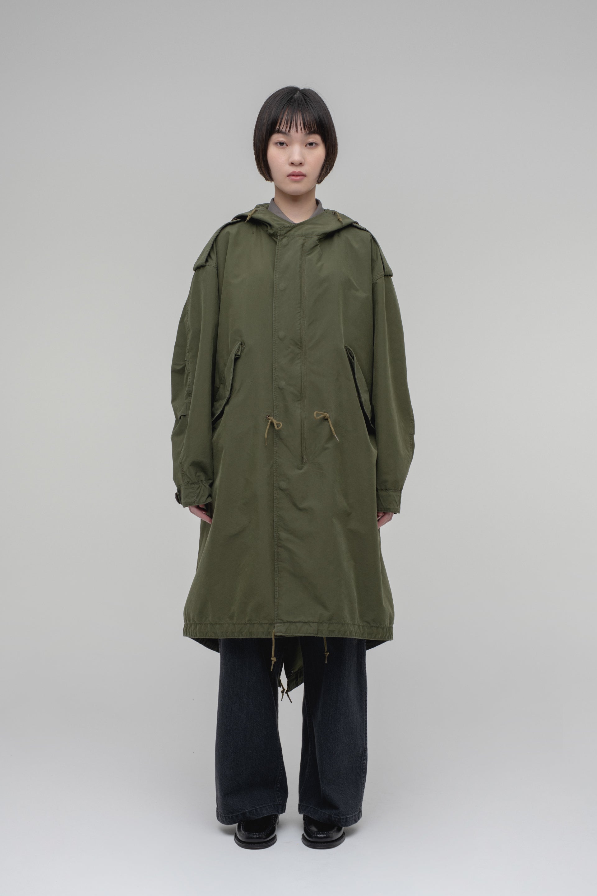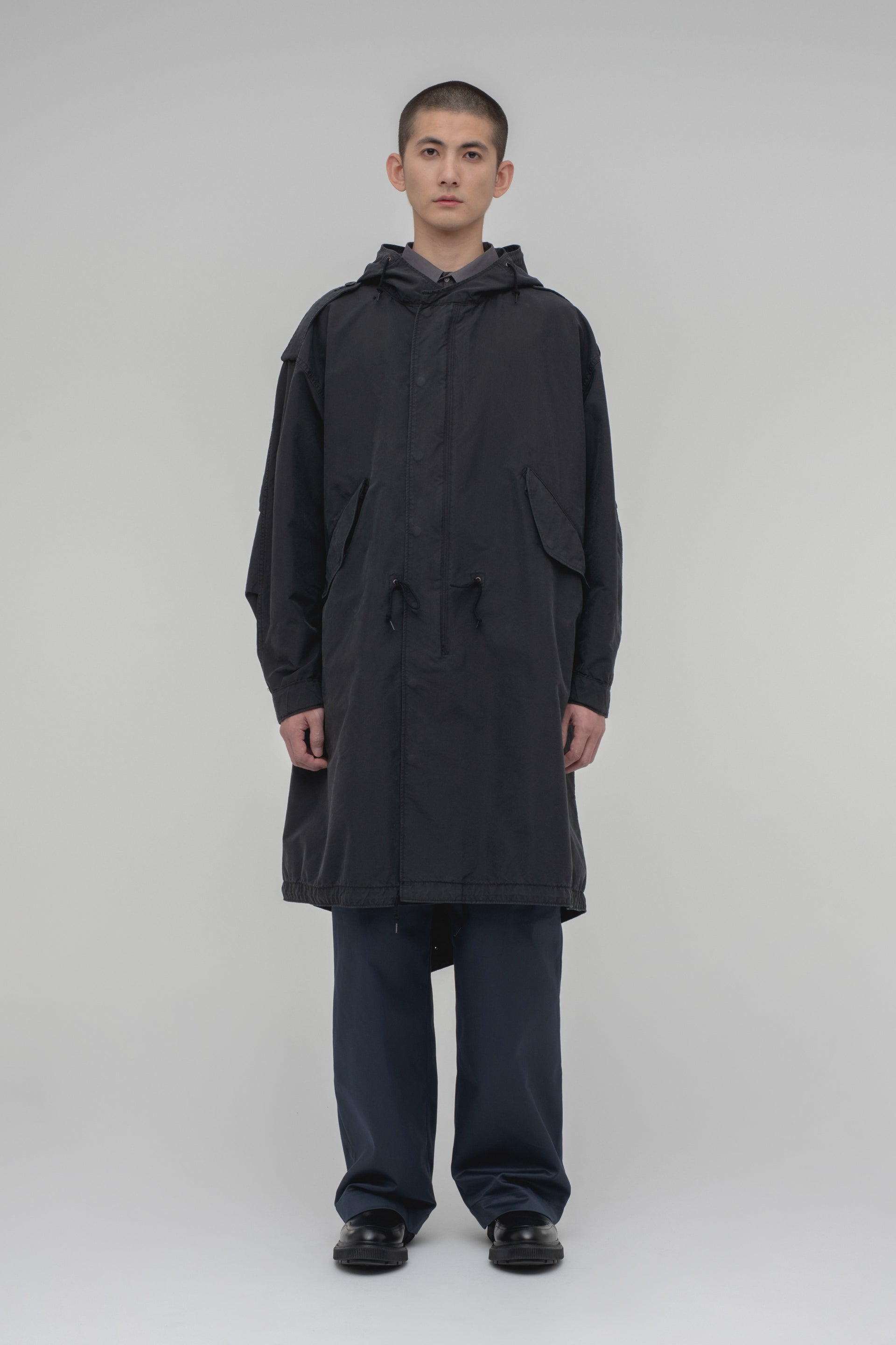 ストーンウォッシュでヴィンテージのような風合いに仕上げたフィッシュテールのシェルパーカ。1950年代にアメリカ軍地上部隊の防寒用コートとして採用されたM-51タイプのデザインで、ボディと一体型のフード、肩のエポーレットなどが特徴です。生地は先染めした100番手双糸のスビンコットンと210dナイロンを高密度に織り上げ、撥水加工を施したオリジナルのツイルクロス。強く洗いをかけることで、もともとしなやかなスビンコットンをいっそう柔らかく、なめらに。何年も着込んだようなマットな質感を最初から楽しめます。着丈も身幅もたっぷりとゆとりを持たせたオーバーサイズシルエット。