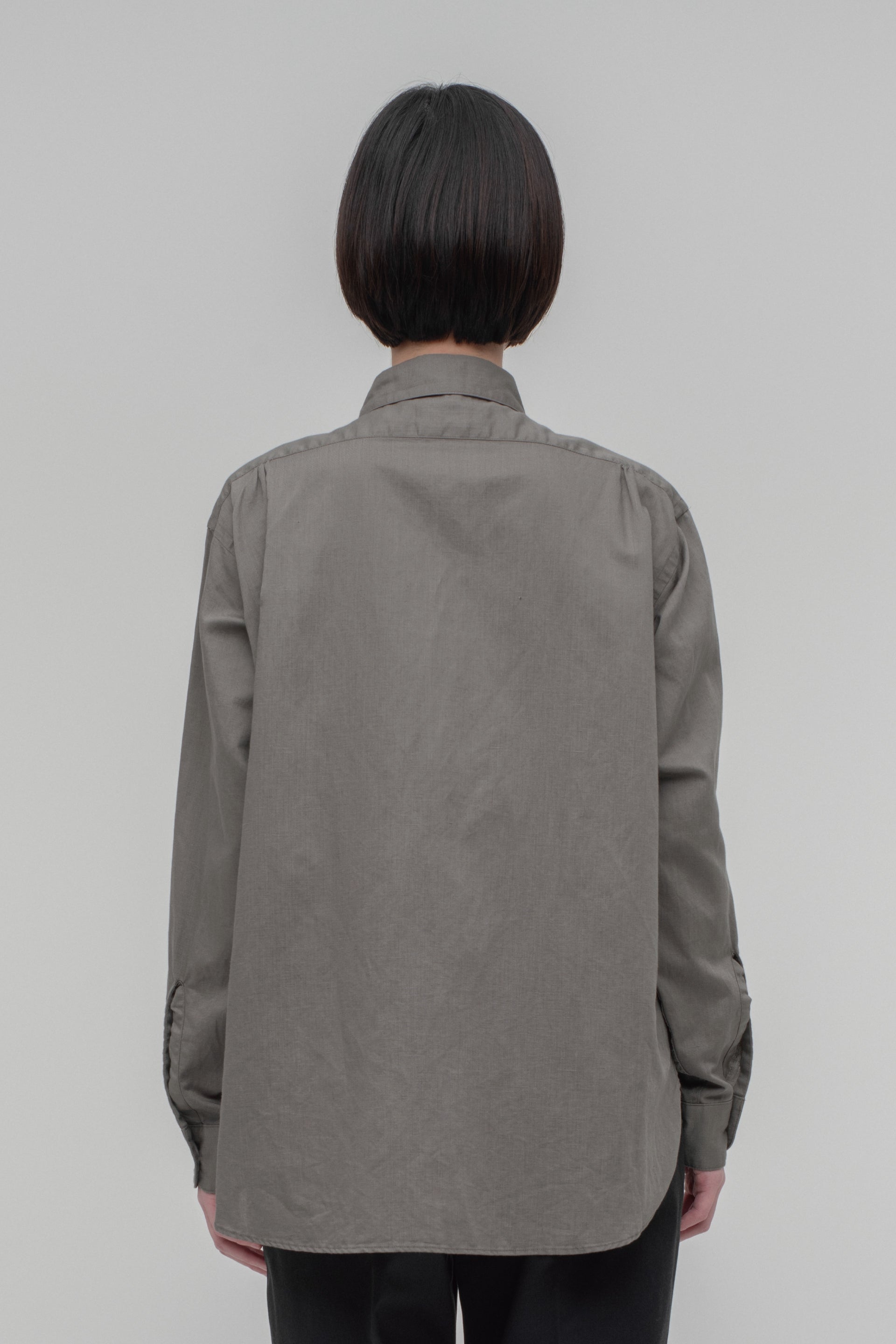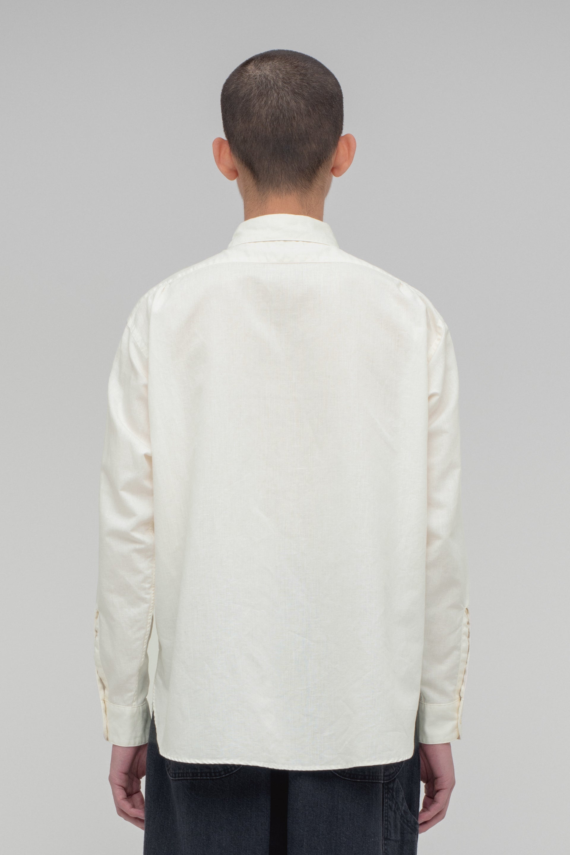 タテ糸にスビンコットン、ヨコ糸にはフランス・ノルマンディー北部で収穫されたリネンを組み合わせて織り上げたコットンリネンポプリンで、レギュラーカラーシャツを作りました。スビンコットンは、その魅力である豊かな膨らみと柔らかさを引き出すために、リング紡績製法を採用。生産効率は低いものの、出来上がった糸は撚りの均一性と強度が高いのが特徴です。スビンコットンのなめらかさと上品な光沢、フレンチリネンのハリと清涼感がブレンドされた生地に仕上がっています。デザインのモチーフは、1960年代のアメリカの古着。ドレスシャツのような細い糸、細かい運針による繊細さと、岡山特有の巻き縫いミシンによるワークウェアのようなカジュアルさが絶妙なバランスで同居しています。