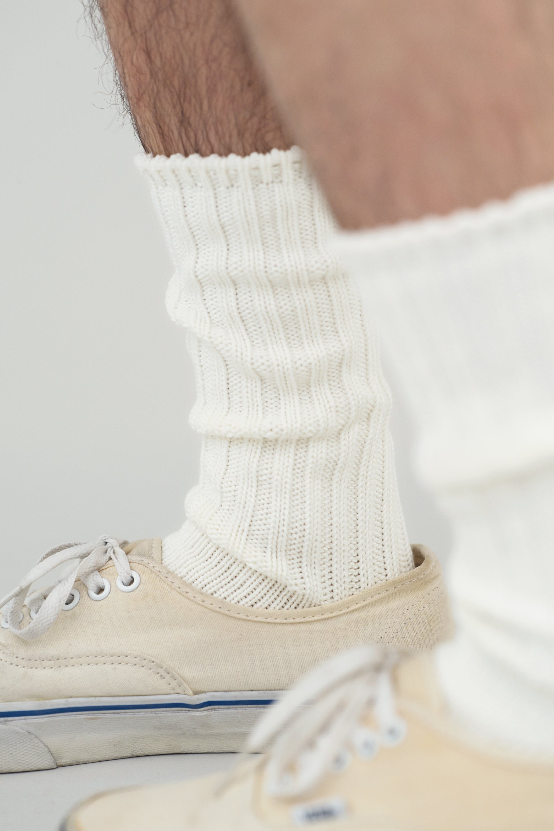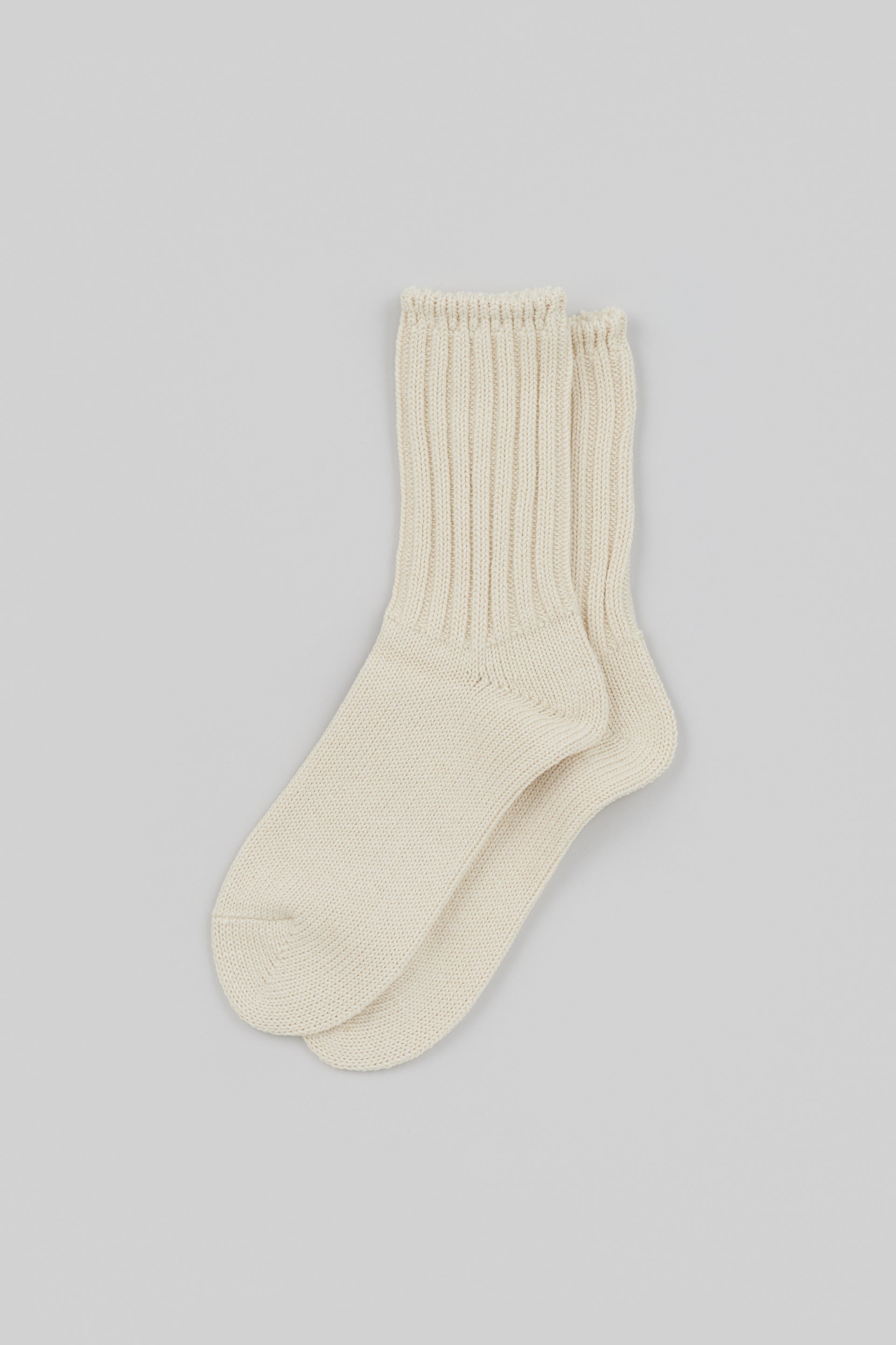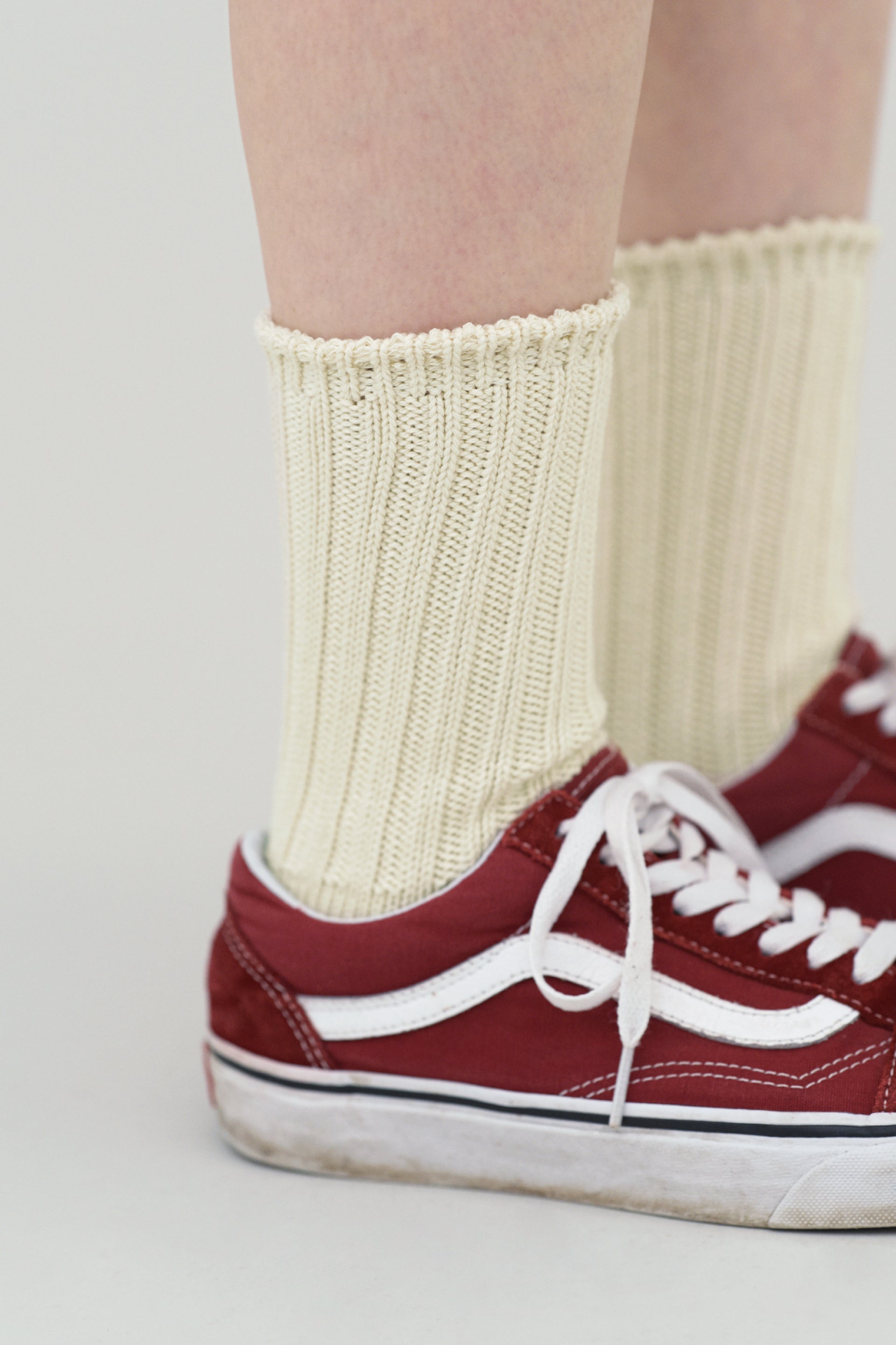 20番手双糸という太い糸で作ったローゲージのリブソックス。日本に数台しかない希少な編み機でふっくらと柔らかく編み立てました。足を通せば、超長繊細綿・スビンコットンの特徴である、滑らかな肌触りとしなやかさを実感するはず。ミドル丈のメンズとアンクル丈のウィメンズ、それぞれ、アイボリーとオフオワイトの2色を展開。