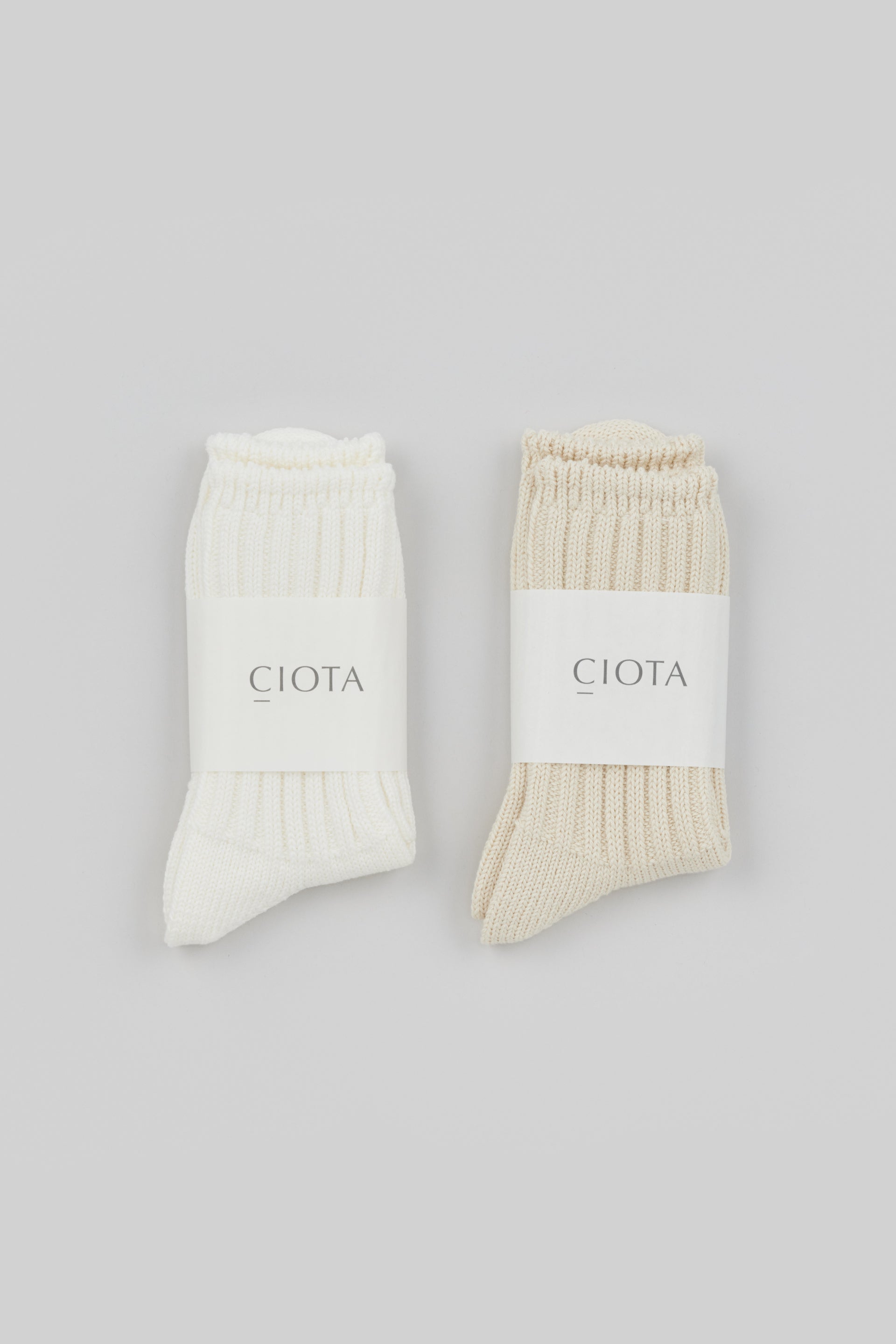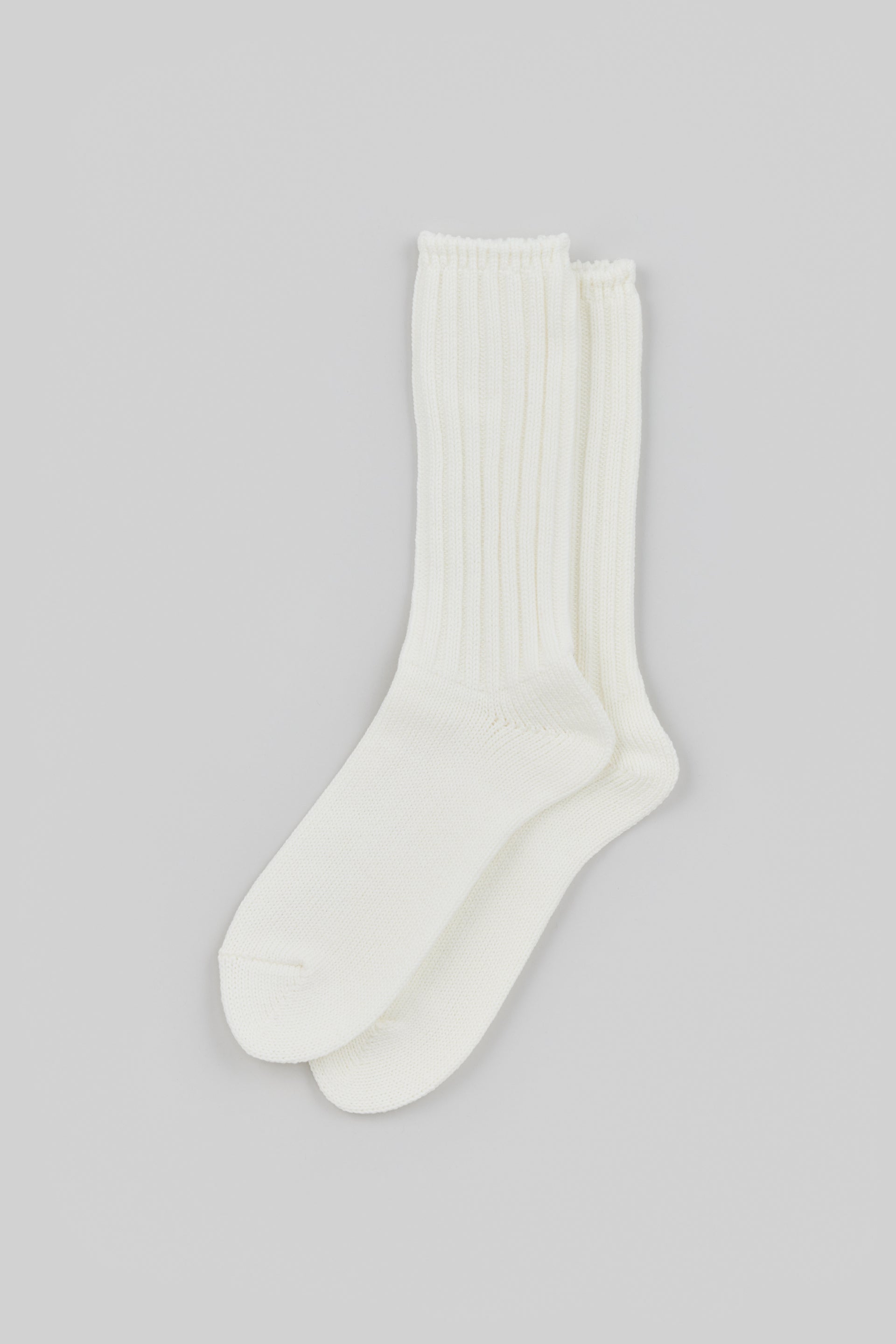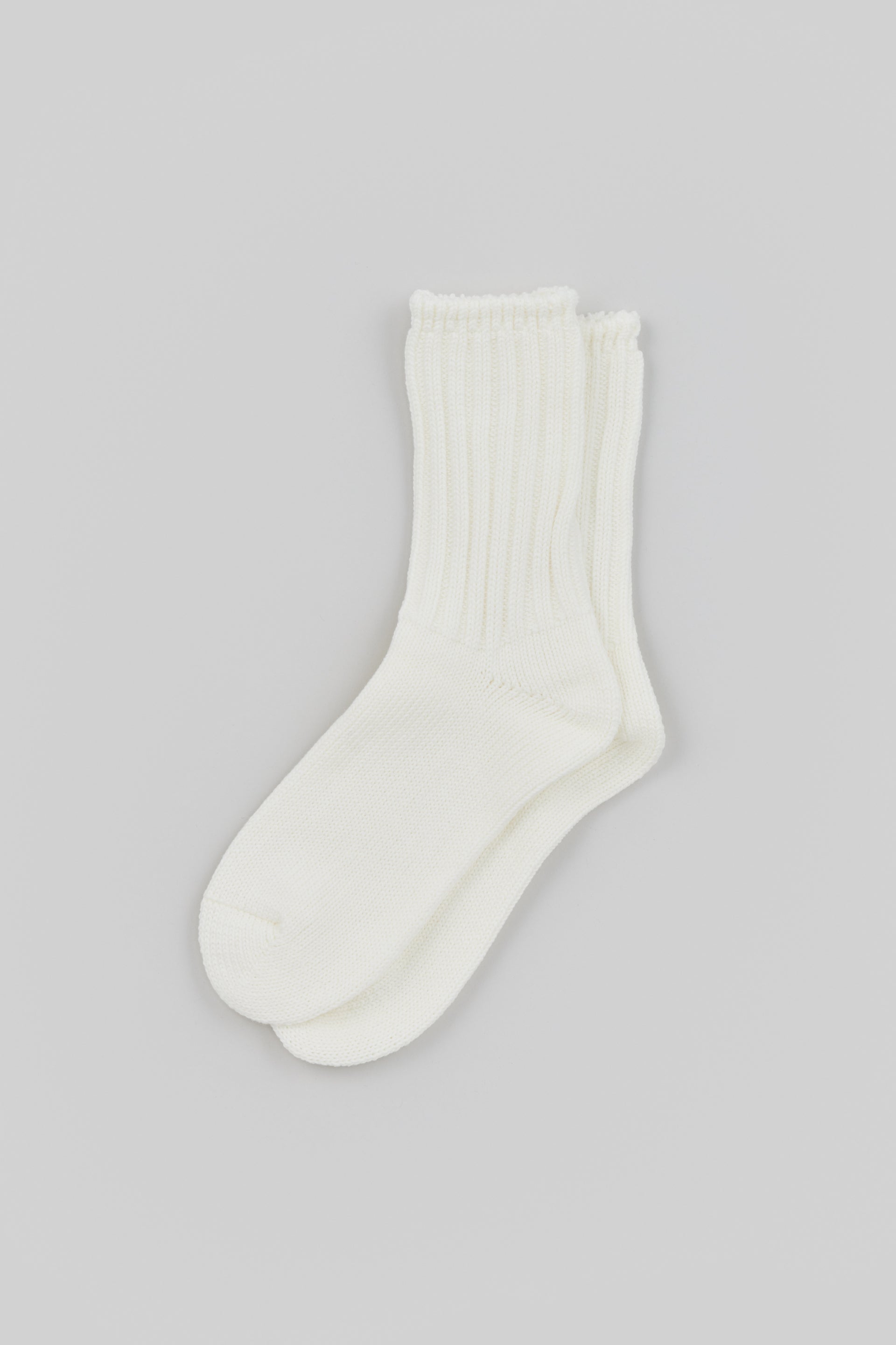 20番手双糸という太い糸で作ったローゲージのリブソックス。日本に数台しかない希少な編み機でふっくらと柔らかく編み立てました。足を通せば、超長繊細綿・スビンコットンの特徴である、滑らかな肌触りとしなやかさを実感するはず。ミドル丈のメンズとアンクル丈のウィメンズ、それぞれ、アイボリーとオフオワイトの2色を展開。