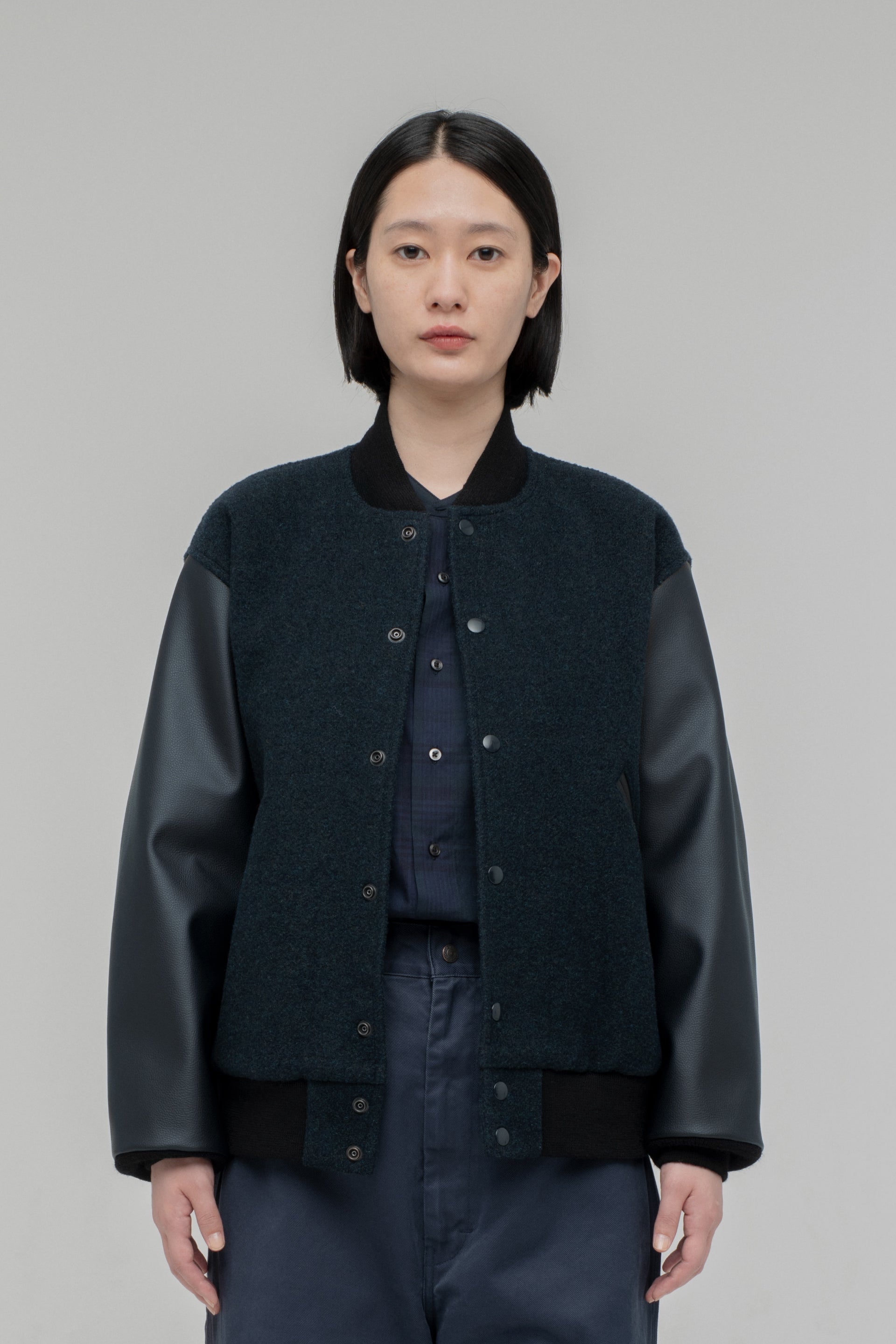装飾を省いたソリッドなスタジアムジャンパー。ボディのヘビーメルトンは、タテ糸に滑らかさと上品な光沢を兼ね備えたスビンコットン、ヨコ糸にヴィンテージ英国式紡績機でゆっくり紡がれた素朴なシェットランドウールという相反する特性を持った原料を掛け合わせて作ったもの。ハリとコシ、そして弾力のあるピュアシェットランドウールを、5~6色ブレンドし、通常よりも時間をかけて高密度に織り込むことで、ヴィンテージのような味わい深い風合いを表現しました。袖に合成皮革、裏地に機能中綿キルトを使用。中綿には熱伝導性が低いTORAYの超繊細繊維を採用。いったん取り込んだ熱を逃しにくく、同じ層で比べればダウンの2倍の暖かさを誇ります。