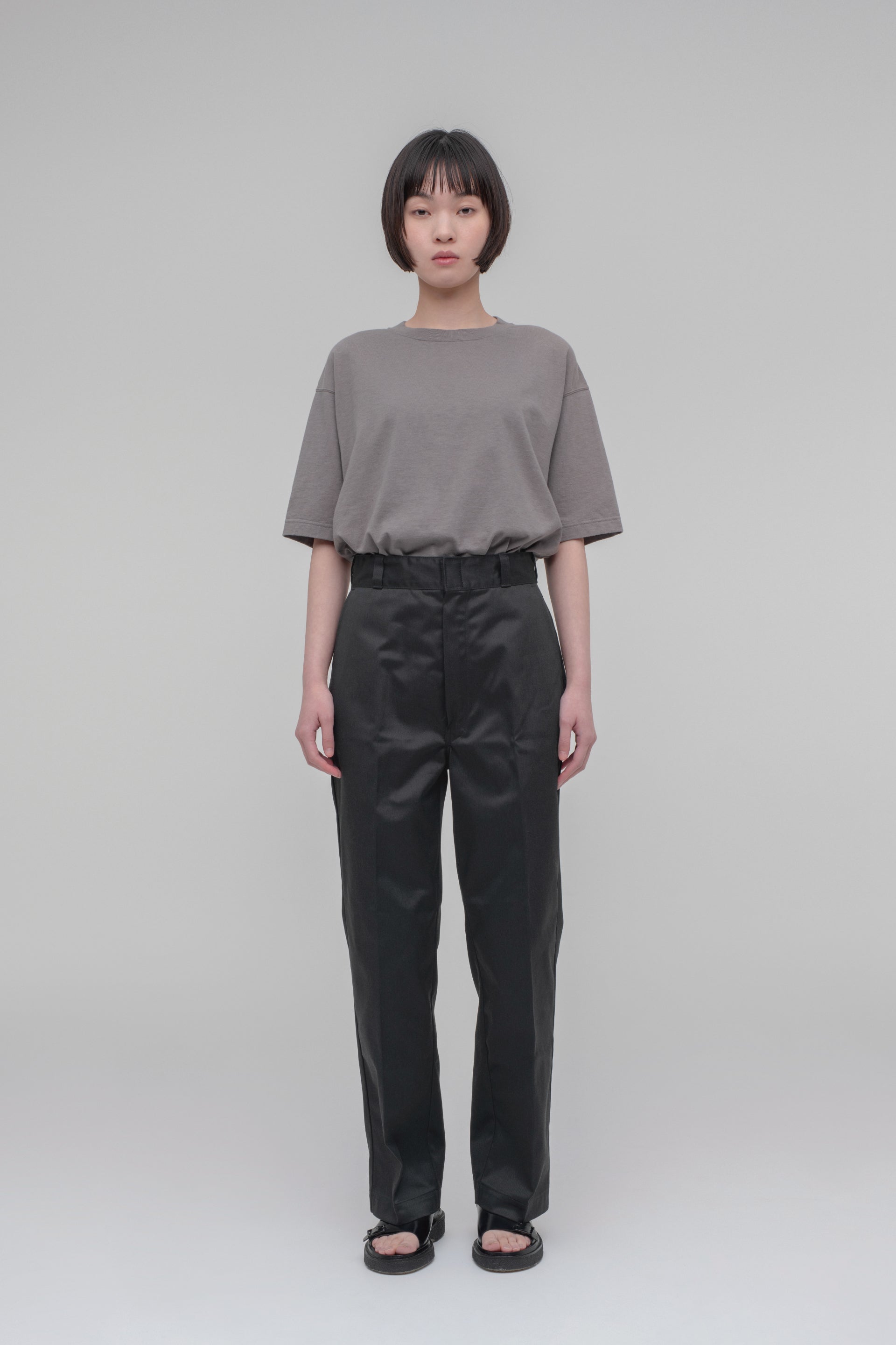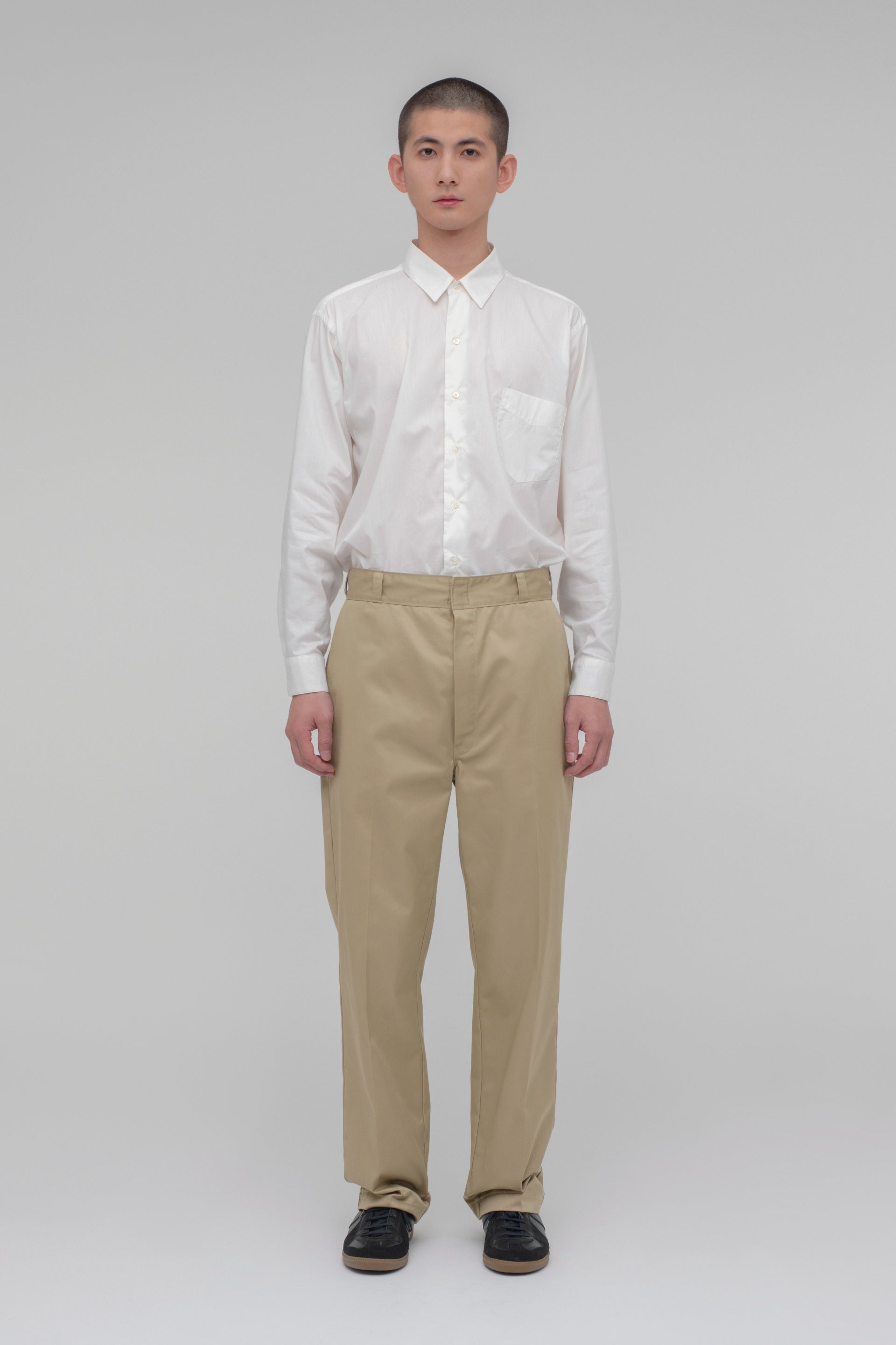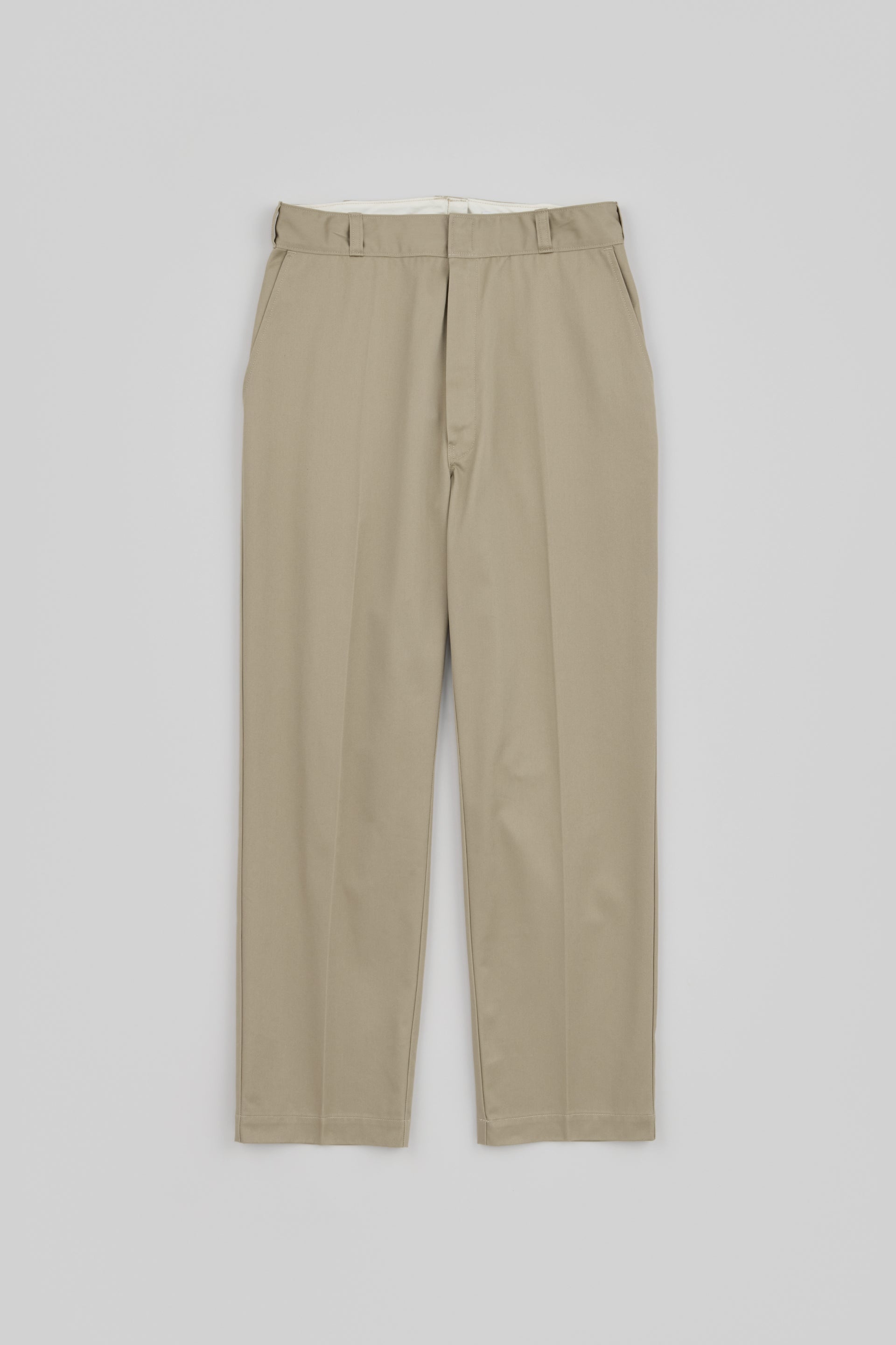 改めてパターンを引き直した、ワークパンツのリニューアルモデル。前モデルよりもややゆったりとしたワイドテーパードシルエットに生まれ変わりました。生地はスビンコットンとリサイクルポリエステル、それぞれ50%ずつをミックスしたオリジナルのT/Cツイル。スビンコットンらしい上品な光沢となめらかな肌触りに加え、ポリエステルならではのハリ感があり、シワになりにくく、センタープレスをキープしやすいのが特徴。カラーはベージュとブラックのほか、チャコールグレーが新たにラインナップ。