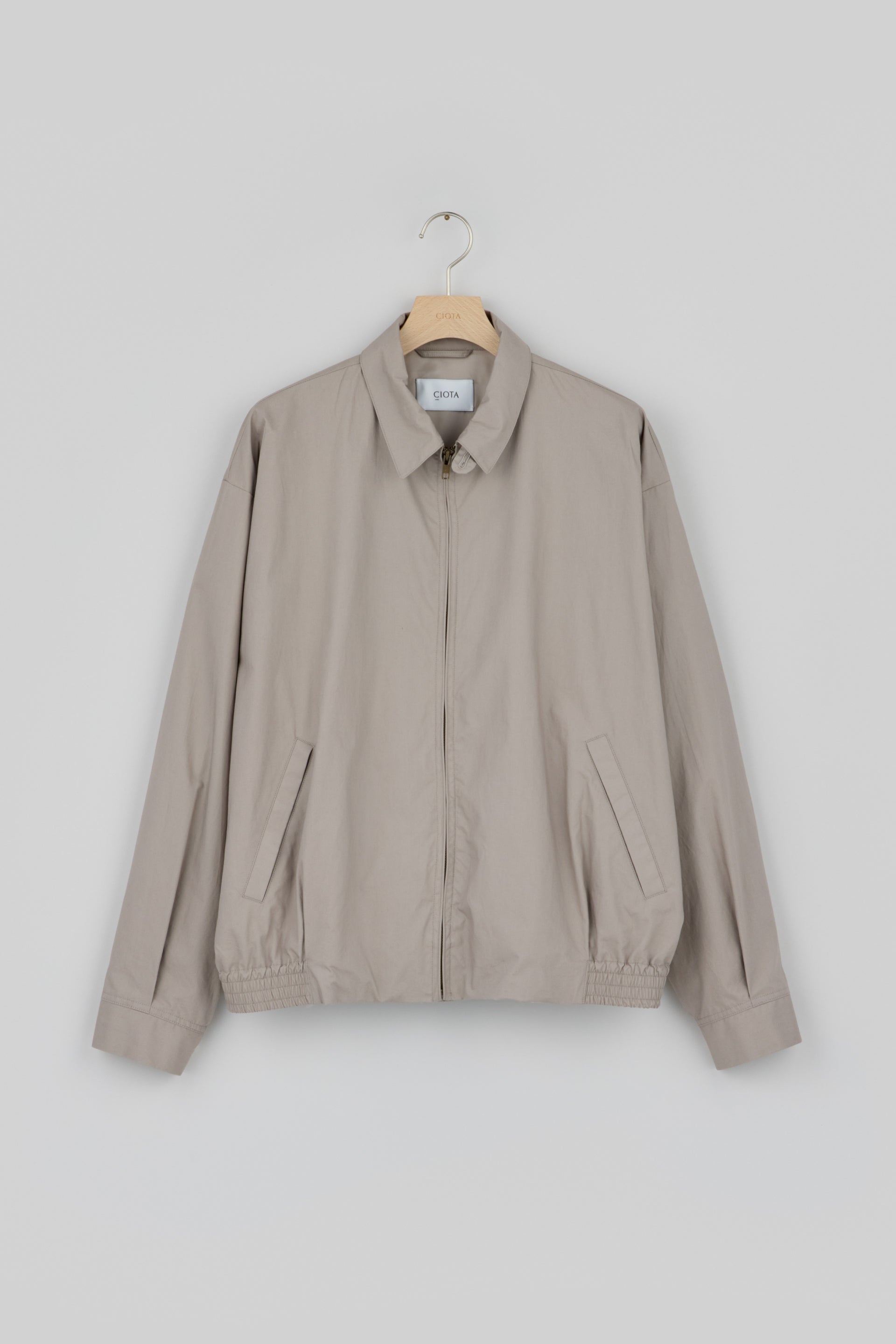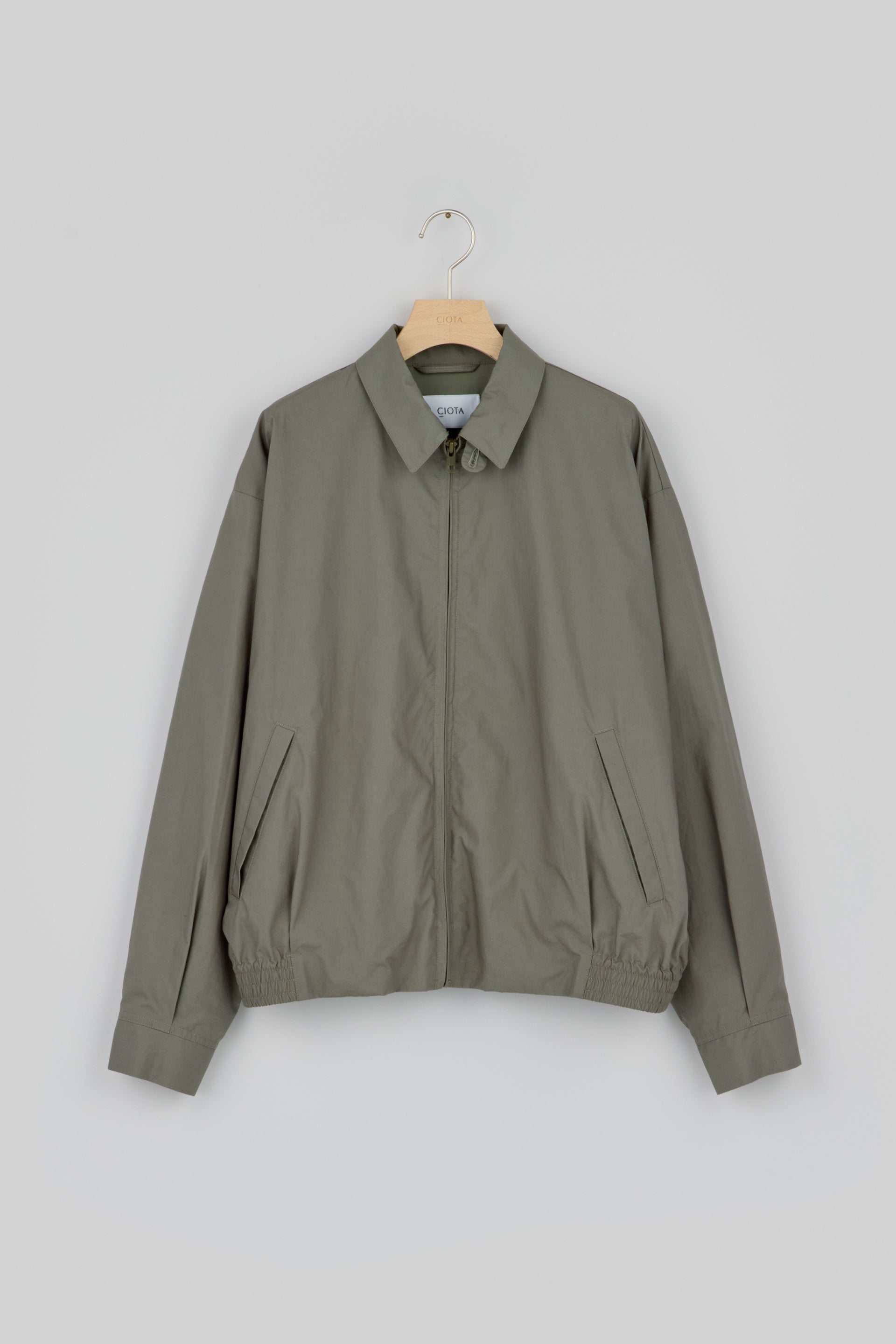 1960年代のアメリカ製ヴィンテージモデルをサンプリングしたスイングトップ(ジップアップジャケット)。生地は40番手単糸のスビンコットンを高密度に織り上げたタイプライタークロス。中番手の糸を撚らずに単糸で使うことで、わずかにムラ感を出し、味わいのある、ナチュラルな表情に仕上げました。仕上げ加工は最小限にとどめ、スビンコットンの上品な光沢、素材本来の風合いを活かしています。袖はセットインスリーブ、裾は緩いシャーリング仕様、襟廻りにはボタン留めスロートタブ付き。